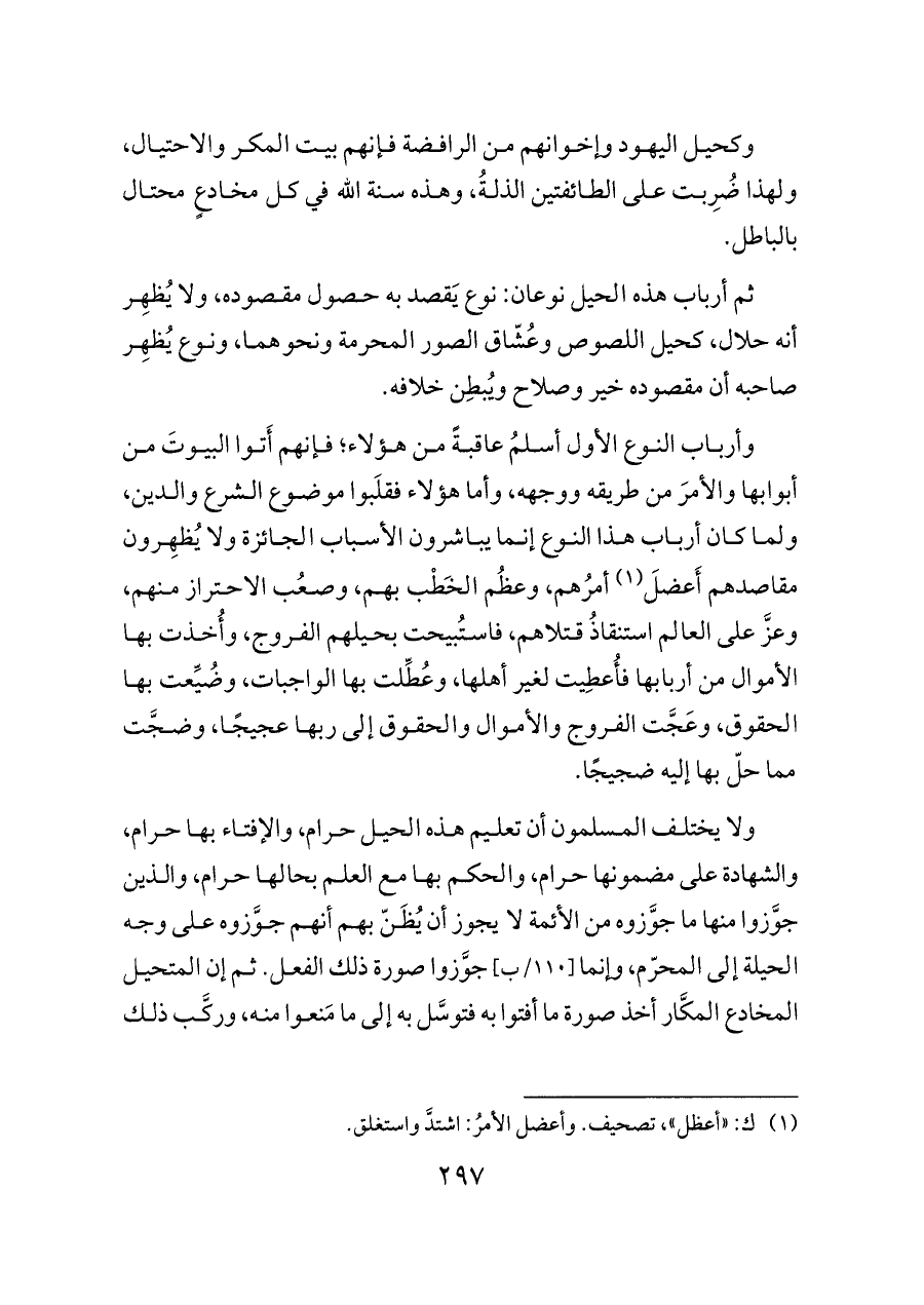 ولا يختلف المسلمون أن تعليم هذه الحيل حرام، والإفتاء بها حرام، والشهادة على مضمونها حرام، والحكم بها مع العلم بحالها حرام، والذين جوَّزوا منها ما جوَّزوه من الأئمة لا يجوز أن يُظَنّ بهم أنهم جوَّزوه على وجه الحيلة إلى المحرّم، وإنما [١١٠/ب] جوَّزوا صورة ذلك الفعل. ثم إن المتحيل المخادع المكَّار أخذ صورة ما أفتوا به فتوسَّل به إلى ما مَنعوا منه، وركَّب ذلك