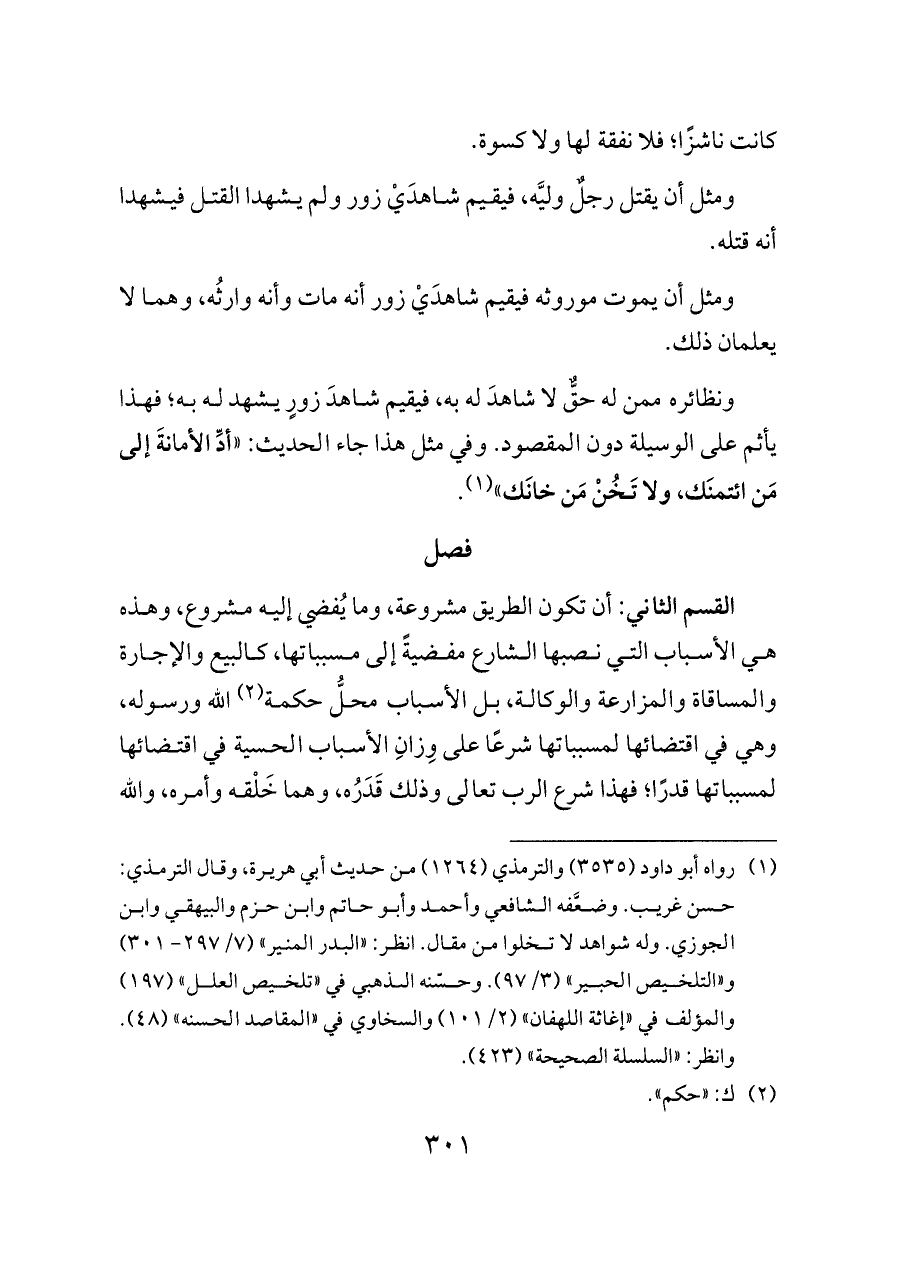 ونظائره ممن له حقٌّ لا شاهدَ له به، فيقيم شاهدَ زورٍ يشهد له به؛ فهذا يأثم على الوسيلة دون المقصود. وفي مثل هذا جاء الحديث: «أدِّ الأمانةَ إلى مَن ائتمنَك، ولا تَخُنْ مَن خانَك» (¬١).