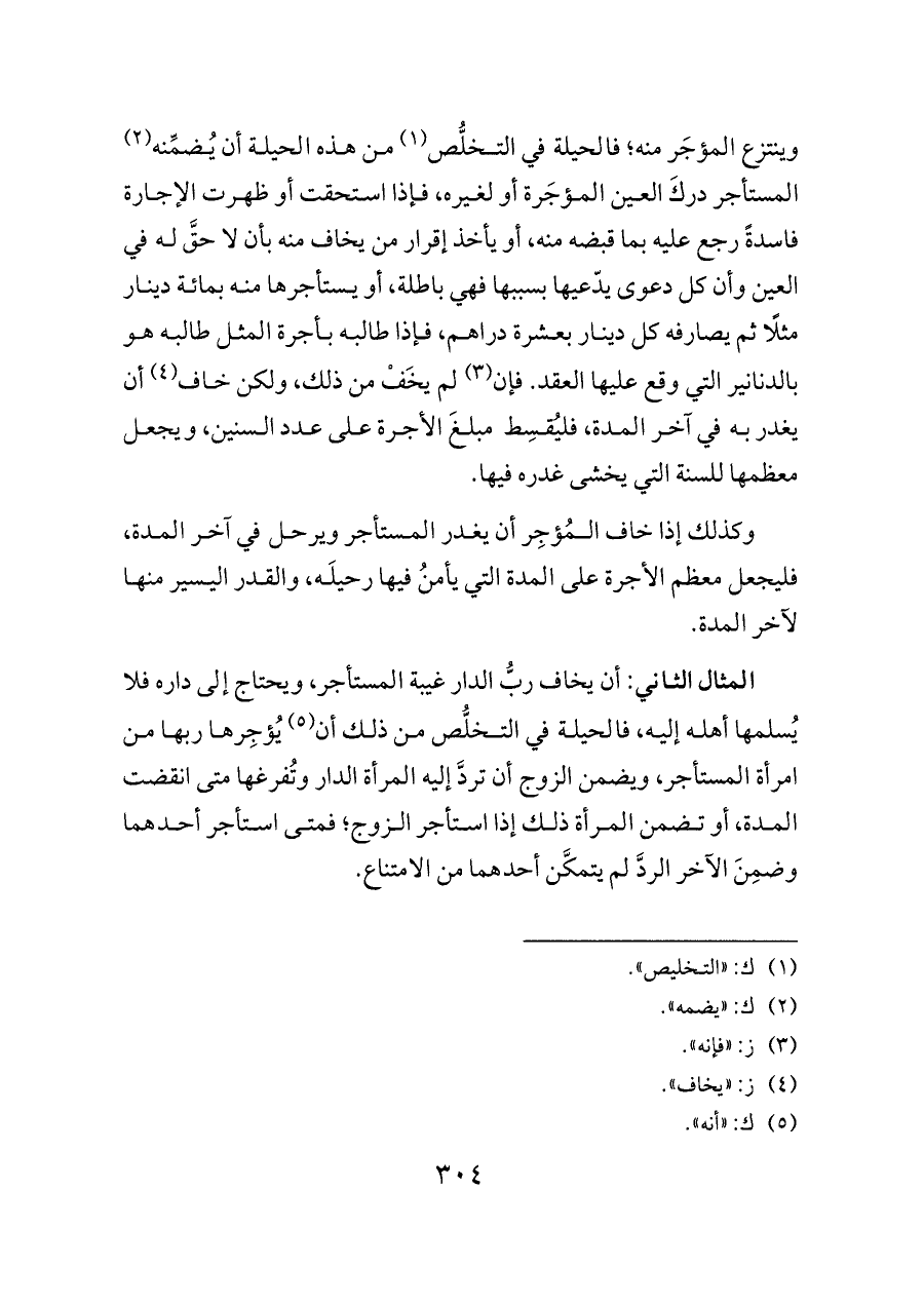 المثال الثاني: أن يخاف ربُّ الدار غيبة المستأجر، ويحتاج إلى داره فلا يُسلمها أهله إليه، فالحيلة في التخلُّص من ذلك أن (¬٥) يُؤجِرها ربها من امرأة المستأجر، ويضمن الزوج أن تردَّ إليه المرأة الدار وتُفرغها متى انقضت المدة، أو تضمن المرأة ذلك إذا استأجر الزوج؛ فمتى استأجر أحدهما وضمِنَ الآخر الردَّ لم يتمكَّن أحدهما من الامتناع.