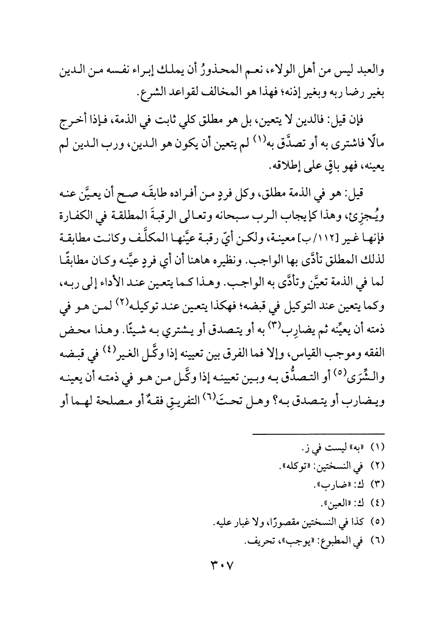 قيل: هو في الذمة مطلق، وكل فردٍ من أفراده طابقَه صح أن يعيَّن عنه ويُجزِئ، وهذا كإيجاب الرب سبحانه وتعالى الرقبةَ المطلقة في الكفارة فإنها غير [١١٢/ب] معينة، ولكن أيّ رقبة عيَّنها المكلَّف وكانت مطابقة لذلك المطلق تأدَّى بها الواجب. ونظيره هاهنا أن أي فردٍ عيَّنه وكان مطابقًا لما في الذمة تعيَّن وتأدَّى به الواجب. وهذا كما يتعين عند الأداء إلى ربه، وكما يتعين عند التوكيل في قبضه؛ فهكذا يتعين عند توكيله (¬٢) لمن هو في ذمته أن يعيِّنه ثم يضارِب (¬٣) به أو يتصدق أو يشتري به شيئًا. وهذا محض الفقه وموجب القياس، وإلا فما الفرق بين تعيينه إذا وكَّل الغير (¬٤) في قبضه والشِّرَى (¬٥) أو التصدُّق به وبين تعيينه إذا وكَّل من هو في ذمته أن يعينه ويضارب أو يتصدق به؟ وهل تحتَ (¬٦) التفريقِ فقهٌ أو مصلحة لهما أو