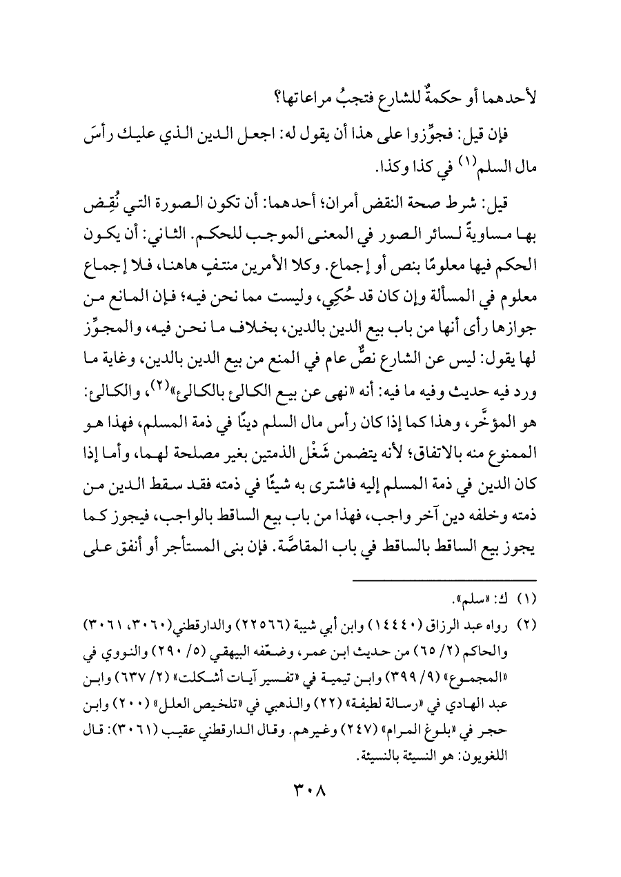 (¬٢) رواه عبد الرزاق (١٤٤٤٠) وابن أبي شيبة (٢٢٥٦٦) والدارقطني (٣٠٦٠، ٣٠٦١) والحاكم (٢/ ٦٥) من حديث ابن عمر، وضعّفه البيهقي (٥/ ٢٩٠) والنووي في «المجموع» (٩/ ٣٩٩) وابن تيمية في «تفسير آيات أشكلت» (٢/ ٦٣٧) وابن عبد الهادي في «رسالة لطيفة» (٢٢) والذهبي في «تلخيص العلل» (٢٠٠) وابن حجر في «بلوغ المرام» (٢٤٧) وغيرهم. وقال الدارقطني عقيب (٣٠٦١): قال اللغويون: هو النسيئة بالنسيئة.