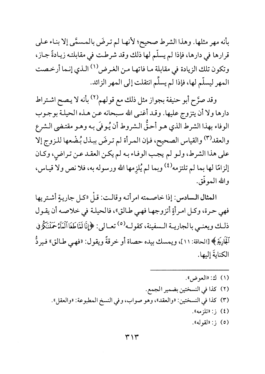 وقد صرَّح أبو حنيفة بجواز مثل ذلك مع قولهم (¬٢) بأنه لا يصح اشتراط دارها ولا أن يتزوج عليها. وقد أغنى الله سبحانه عن هذه الحيلة بوجوب الوفاء بهذا الشرط الذي هو أحقُّ الشروط أن يُوفَى به وهو مقتضى الشرع والعقد (¬٣) والقياس الصحيح، فإن المرأة لم ترضَ ببذل بُضْعها للزوج إلا على هذا الشرط، ولو لم يجب الوفاء به لم يكن العقد عن تراضٍ، وكان إلزامًا لها بما لم تلتزمه (¬٤) وبما لم يُلزِمها الله ورسوله به، فلا نص ولا قياس، والله الموفّق.