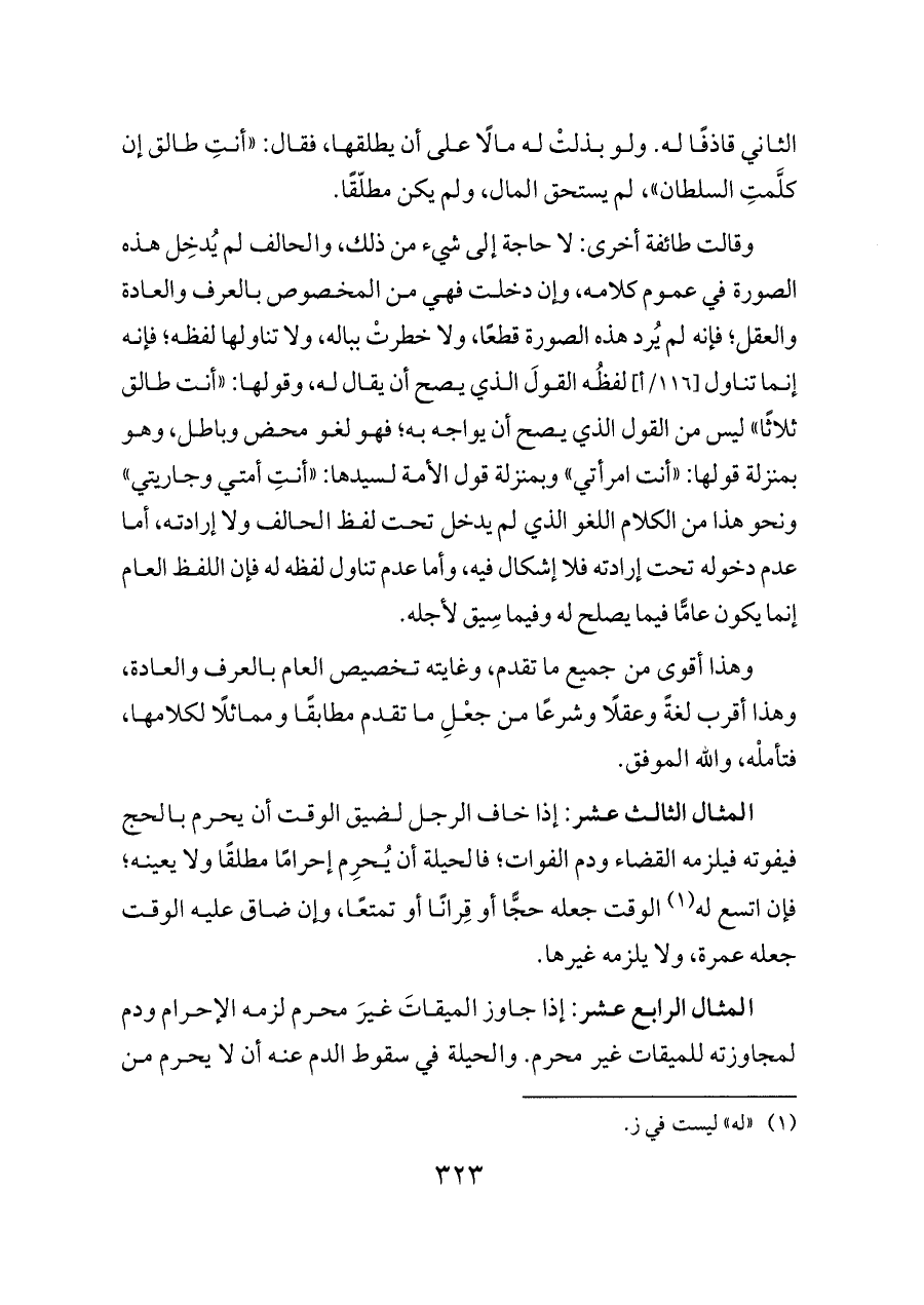 وهذا أقوى من جميع ما تقدم، وغايته تخصيص العام بالعرف والعادة، وهذا أقرب لغةً وعقلًا وشرعًا من جعْلِ ما تقدم مطابقًا ومماثلًا لكلامها، فتأملْه، والله الموفق.