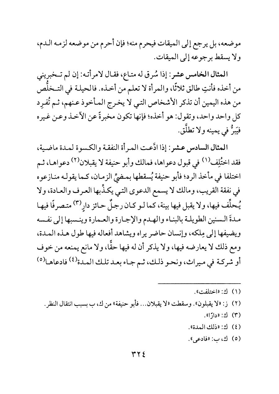 المثال الخامس عشر: إذا سُرق له متاع، فقال لامرأته: إن لم تخبريني من أخذه فأنتِ طالق ثلاثًا، والمرأة لا تعلم من أخذه. فالحيلة في التخلُّص من هذه اليمين أن تذكر الأشخاص التي لا يخرج المأخوذ عنهم، ثم تُفرِد كل واحد واحد، وتقول: هو أخذه؛ فإنها تكون مخبرةً عن الآخذ وعن غيره فيَبرُّ في يمينه ولا تطلَّق.