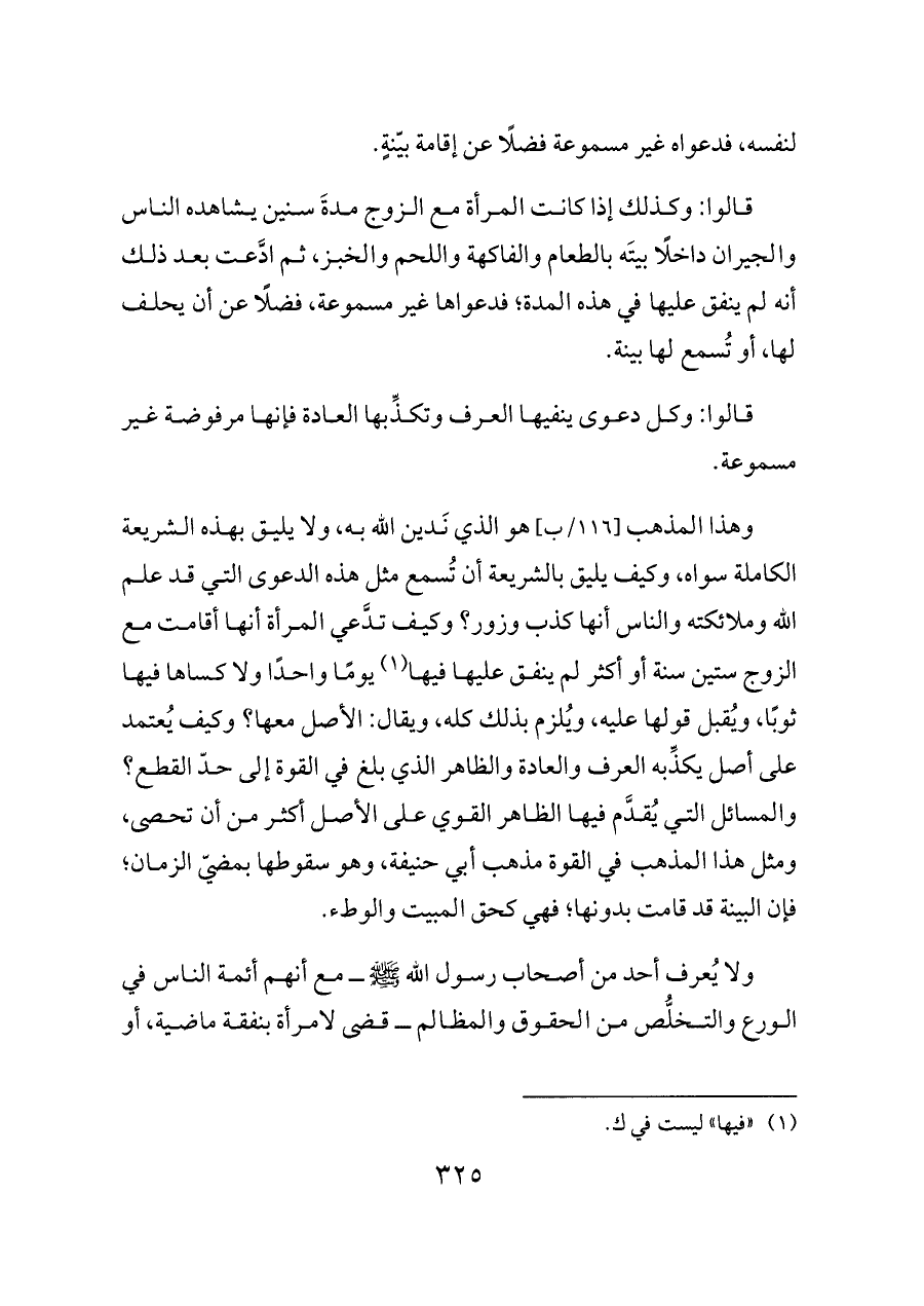 قالوا: وكذلك إذا كانت المرأة مع الزوج مدةَ سنين يشاهده الناس والجيران داخلًا بيتَه بالطعام والفاكهة واللحم والخبز، ثم ادَّعت بعد ذلك أنه لم ينفق عليها في هذه المدة؛ فدعواها غير مسموعة، فضلًا عن أن يحلف لها، أو تُسمع لها بينة.