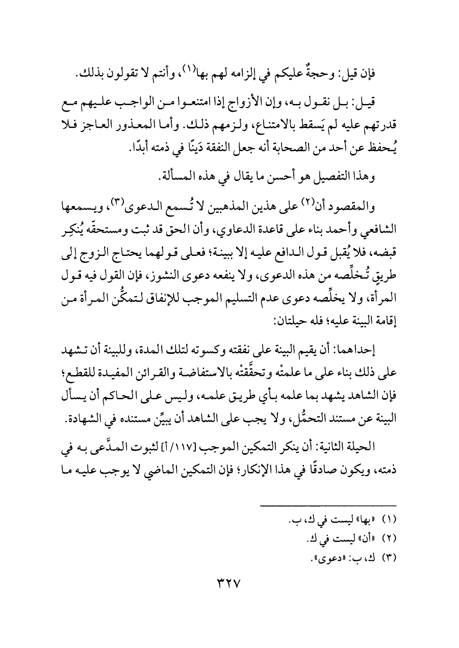 والمقصود أن (¬٢) على هذين المذهبين لا تُسمع الدعوى (¬٣)، ويسمعها الشافعي وأحمد بناء على قاعدة الدعاوي، وأن الحق قد ثبت ومستحقّه يُنكِر قبضه، فلا يُقبل قول الدافع عليه إلا ببينة؛ فعلى قولهما يحتاج الزوج إلى طريقٍ تُخلِّصه من هذه الدعوى، ولا ينفعه دعوى النشوز، فإن القول فيه قول المرأة، ولا يخلِّصه دعوى عدم التسليم الموجب للإنفاق لتمكُّن المرأة من إقامة البينة عليه؛ فله حيلتان: