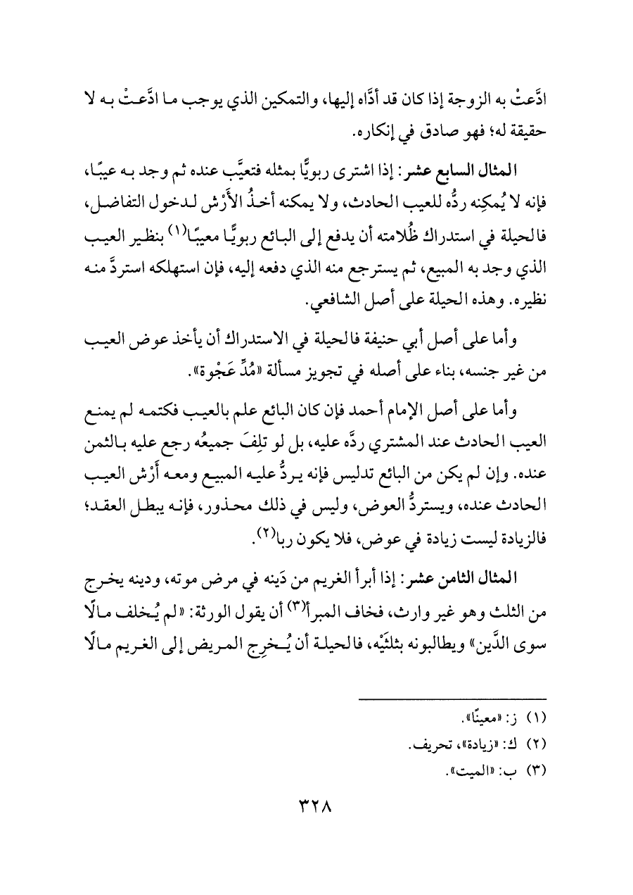 المثال السابع عشر: إذا اشترى ربويًّا بمثله فتعيَّب عنده ثم وجد به عيبًا، فإنه لا يُمكِنه ردُّه للعيب الحادث، ولا يمكنه أخذُ الأَرْش لدخول التفاضل، فالحيلة في استدراك ظُلامته أن يدفع إلى البائع ربويًّا معيبًا (¬١) بنظير العيب الذي وجد به المبيع، ثم يسترجع منه الذي دفعه إليه، فإن استهلكه استردَّ منه نظيره. وهذه الحيلة على أصل الشافعي.