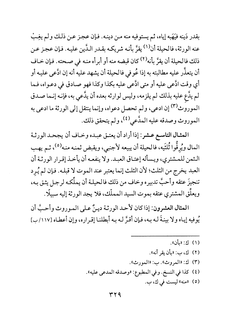 بقدر دَينه فيَهَبه إياه، ثم يستوفيه منه من دينه. فإن عجز عن ذلك ولم يغِبْ عنه الورثة، فالحيلة أن (¬١) يقرَّ بأنه شريكه بقدر الدَّين عليه. فإن عجز عن ذلك فالحيلة أن يقرَّ بأنه (¬٢) كان قبضه منه أو أبرأه منه في صحته. فإن خاف أن يتعذَّر عليه مطالبته به إذا عُوفي فالحيلة أن يشهد عليه أنه إن ادَّعى عليه أو أي وقت ادَّعى عليه أو متى ادَّعى عليه بكذا وكذا فهو صادق في دعواه، فما لم يدَّعِ عليه بذلك لم يلزمه، وليس لوارثه بعده أن يدَّعي به، فإنه إنما صدق الموروث (¬٣) إن ادعى، ولم تحصل دعواه، وإنما ينتقل إلى الورثة ما ادعى به الموروث وصدقه عليه المدَّعي (¬٤)، ولم يتحقق ذلك.