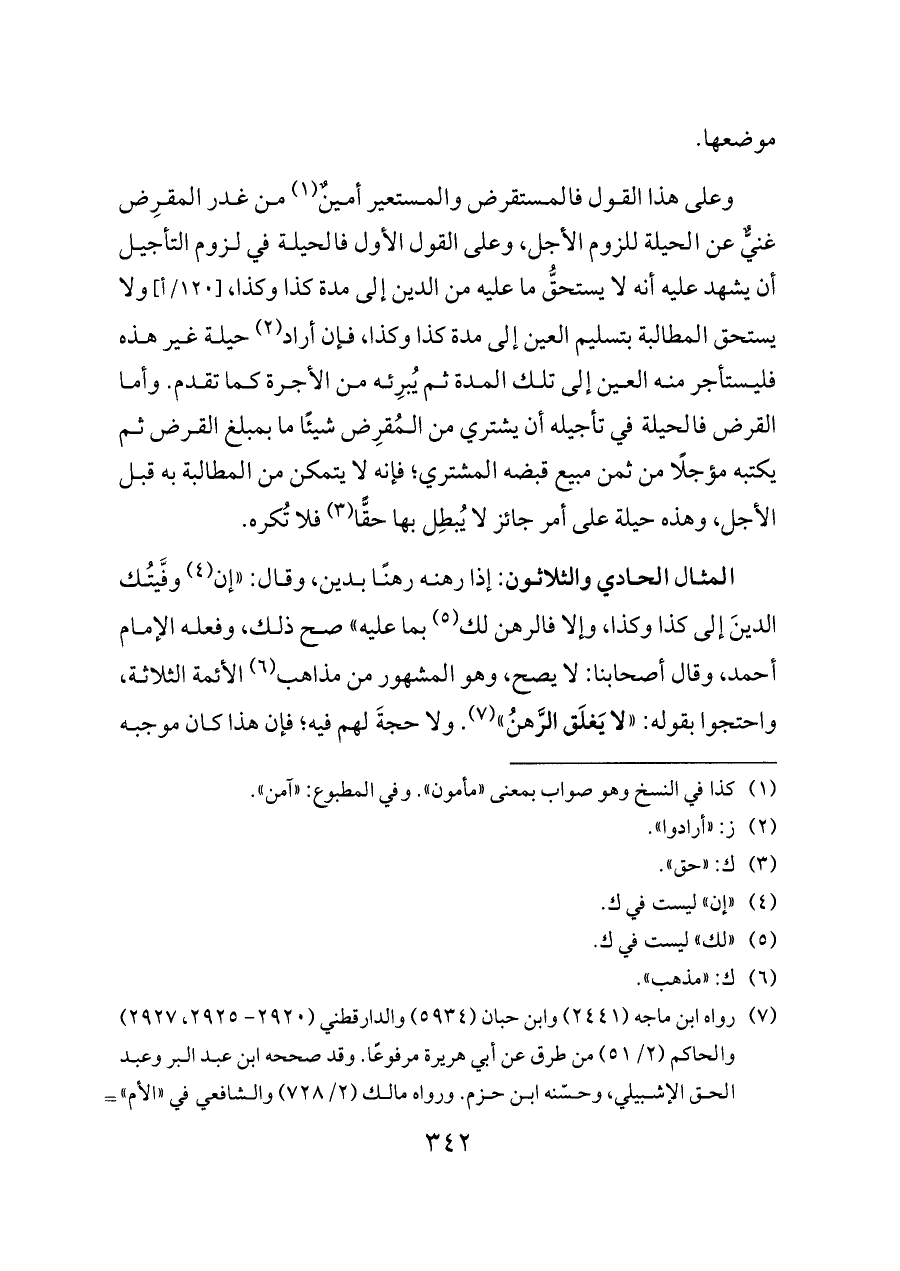 وعلى هذا القول فالمستقرض والمستعير أمينٌ (¬١) من غدر المقرِض غنيٌّ عن الحيلة للزوم الأجل، وعلى القول الأول فالحيلة في لزوم التأجيل أن يشهد عليه أنه لا يستحقُّ ما عليه من الدين إلى مدة كذا وكذا، [١٢٠/أ] ولا يستحق المطالبة بتسليم العين إلى مدة كذا وكذا، فإن أراد (¬٢) حيلة غير هذه فليستأجر منه العين إلى تلك المدة ثم يُبرِئه من الأجرة كما تقدم. وأما القرض فالحيلة في تأجيله أن يشتري من المُقرِض شيئًا ما بمبلغ القرض ثم يكتبه مؤجلًا من ثمن مبيع قبضه المشتري؛ فإنه لا يتمكن من المطالبة به قبل الأجل، وهذه حيلة على أمر جائز لا يُبطِل بها حقًّا (¬٣) فلا تُكره.