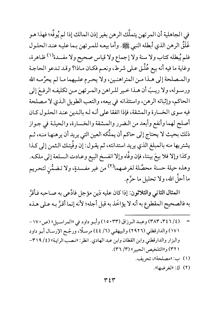 في الجاهلية أن المرتهن يتملَّك الرهن بغير إذن المالك إذا لم يُوفِّه؛ فهذا هو غَلَقُ الرهن الذي أبطله النبي - صلى الله عليه وسلم -. وأما بيعه للمرتهن بما عليه عند الحلول فلم يُبطله كتاب ولا سنة ولا إجماع ولا قياس صحيح ولا مفسدة (¬١)