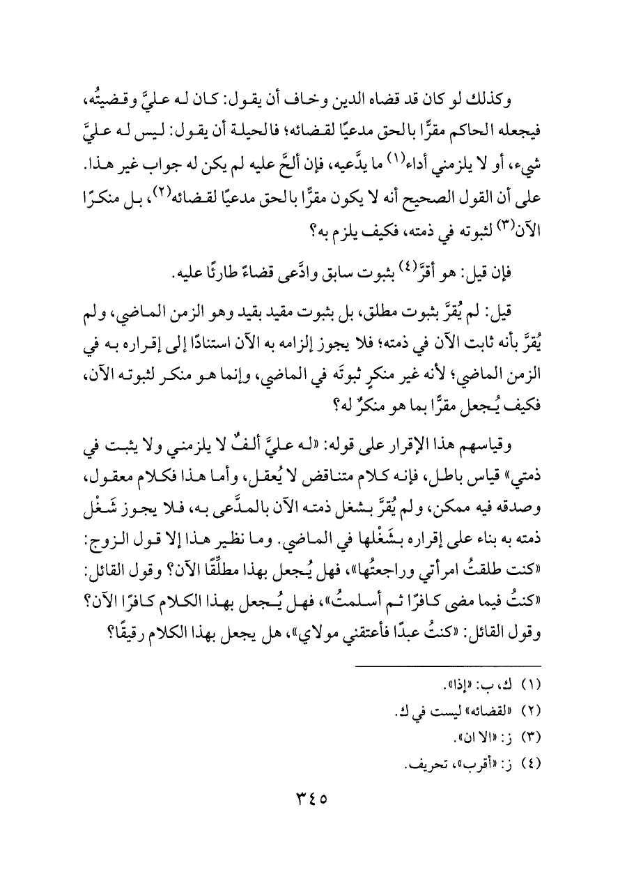 قيل: لم يُقرَّ بثبوت مطلق، بل بثبوت مقيد بقيد وهو الزمن الماضي، ولم يُقرَّ بأنه ثابت الآن في ذمته؛ فلا يجوز إلزامه به الآن استنادًا إلى إقراره به في الزمن الماضي؛ لأنه غير منكرٍ ثبوتَه في الماضي، وإنما هو منكر لثبوته الآن، فكيف يُجعل مقرًّا بما هو منكرٌ له؟