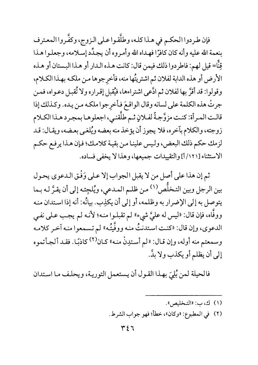فإن طردوا الحكم في هذا كله، وطلَّقوا على الزوج، وكفَّروا المعترف بنعمة الله عليه وأنه كان كافرًا فهداه الله وأمروه أن يجدِّد إسلامه، وجعلوا هذا قِنًّا= قيل لهم: فاطردوا ذلك فيمن قال: كانت هذه الدار أو هذا البستان أو هذه الأرض أو هذه الدابة لفلان ثم اشتريتُها منه، فأخرِجوها من ملكه بهذا الكلام، وقولوا: قد أقرَّ بها لفلان ثم ادَّعى اشتراءها، فيُقبل إقراره ولا تُقبل دعواه، فمن جرتْ هذه الكلمة على لسانه وقال الواقعَ فأخرِجوا ملكه من يده. وكذلك إذا قالت المرأة: كنت مزوَّجةً لفلانٍ ثم طلَّقني، اجعلوها بمجرد هذا الكلام زوجته، والكلام بآخره، فلا يجوز أن يؤخذ منه بعضه ويُلغى بعضه، ويقال: قد لزمك حكم ذلك البعض، وليس علينا من بقية كلامك؛ فإن هذا يرفع حكم الاستثناء [١٢١/أ] والتقييدات جميعها، وهذا لا يخفى فساده.
