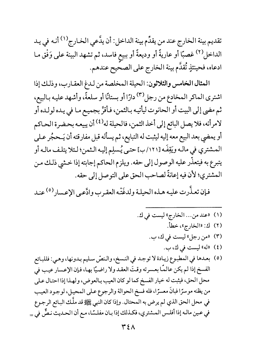 (¬٥) بعدها في المطبوع زيادة لا توجد في النسخ، والنصّ سليم بدونها، وهي: فللبائع الفسخ إذا لم يكن عالمًا بعسرته وقتَ العقد ولا راضيًا بها، فإن الإعسار عيب في محل الحق، فيثبت له خيار الفسخ كما لو كان العيب بالعوض، ولهذا إذا احتال على من يظنه موسرًا فبانَ معسرًا، فله فسخ الحوالة والرجوع على المحيل، لوجود العيب في محل الحق الذي لم يرض به المحتال. وإذا كان النبي - صلى الله عليه وسلم - قد ملَّك البائع الرجوع في عين ماله إذا أفلس المشتري، فكذلك إذا بان مفلسًا، مع أن الحديث نصٌّ في تمليكه الفسخ إذا عرض له الإفلاس، وليس فيه اشتراط حجر الحاكم، ولا دلَّ عليه بوجهٍ، ولا له أصل من كتاب ولا سنة ولا إجماع ولا قياس ولا مصلحة للناس، فمن أين لكم أنه لا يملك الفسخ حتى يحجر عليه الحاكم؟ وحكمُ سيد الحكّام بالرجوع في عين المال وفسخ البيع أولى بالاعتبار والمراعاة من آحاد الناس، فإذا كان سيد الحكّام قد حكم له بالفسخ والرجوع لم يجز أن يقال: لا رجوع لك حتى يحكم حاكم بالفلس والإعسار. فإن قيل: إنما شرطنا ذلك ليتحقق ثبوت فلسه، قيل: لو تحقق ثبوت فلسه بحيث أن لا يشك فيه ولم يحكم به حاكم لم تمكّنوه من الفسخ، وهذا مخالف للسنة والقياس المحض كما تقدم، إذ العيب في محل العوض كالعيب في العوض. فإن سأل الحاكم الحجر عليه وفعل ذلك رجع عليه في عين ماله عند الجمهور».