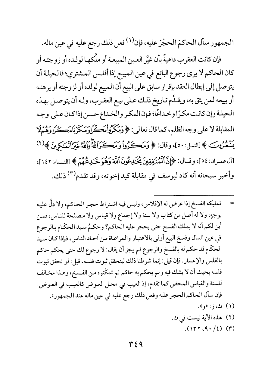 فإن كانت العقرب داهيةً بأن غيَّر العين المبيعة أو ملَّكها لولده أو زوجته أو كان الحاكم لا يرى رجوع البائع في عين المبيع إذا أفلس المشتري؛ فالحيلة أن يتوصل إلى إبطال العقد بإقرار سابق على البيع أن المبيع لولده أو لزوجته أو يرهنه أو يبيعه لمن يثق به، ويقدِّم تاريخ ذلك على بيع العقرب، وله أن يتوصل بهذه الحيلة وإن كانت مكرًا وخداعًا؛ فإن المكر والخداع حسن إذا كان على وجه المقابلة لا على وجه الظلم، كما قال تعالى: {وَمَكَرُوا مَكْرًا وَمَكَرْنَا مَكْرًا وَهُمْ لَا يَشْعُرُونَ} [النمل: ٥٠]، وقال: {وَمَكَرُوا وَمَكَرَ اللَّهُ وَاللَّهُ خَيْرُ الْمَاكِرِينَ} (¬٢) [آل عمران: ٥٤]، وقال: {إِنَّ الْمُنَافِقِينَ يُخَادِعُونَ اللَّهَ وَهُوَ خَادِعُهُمْ} [النساء: ١٤٢]، وأخبر سبحانه أنه كاد ليوسف في مقابلة كيد إخوته، وقد تقدم (¬٣) ذلك.