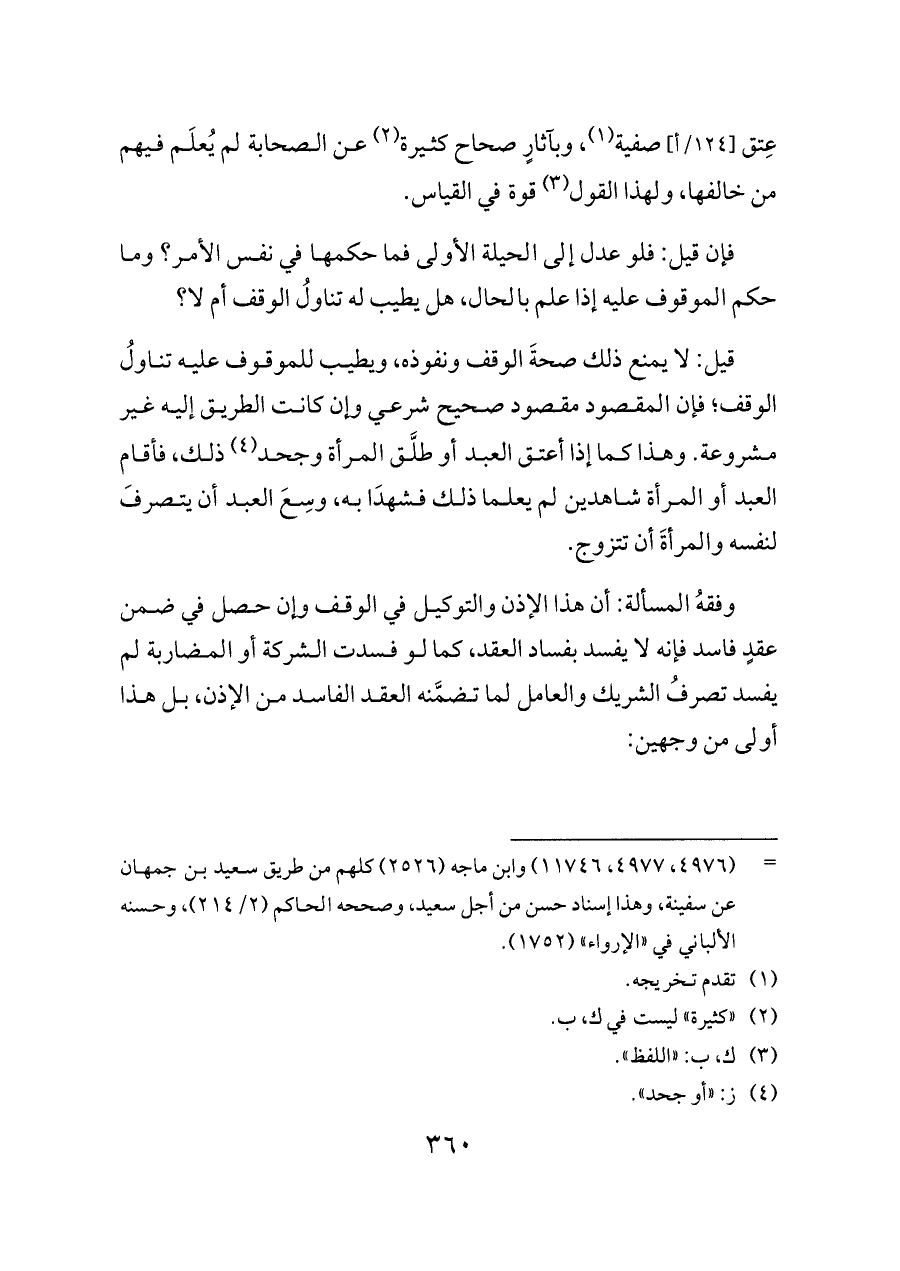 عِتق [١٢٤/أ] صفية (¬١)، وبآثارٍ صحاح كثيرة (¬٢) عن الصحابة لم يُعلَم فيهم من خالفها، ولهذا القول (¬٣) قوة في القياس.