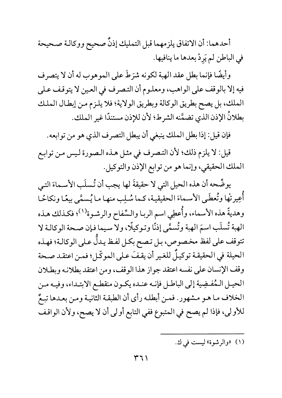 يوضِّحه أن هذه الحيل التي لا حقيقةَ لها يجب أن تُسلَب الأسماءَ التي أُعِيرتْها وتُعطَى الأسماءَ الحقيقية، كما سُلِب منها ما يُسمَّى بيعًا ونكاحًا وهديةً هذه الأسماء، وأُعطِي اسم الربا والسِّفاح والرشوة (¬١)؛ فكذلك هذه الهبة تُسلَب اسمَ الهبة وتُسمَّى إذنًا وتوكيلًا، ولا سيما فإن صحة الوكالة لا تتوقف على لفظ مخصوص، بل تصح بكل لفظ يدلُّ على الوكالة؛ فهذه الحيلة في الحقيقة توكيلٌ للغير أن يقفَ على الموكّل؛ فمن اعتقد صحة وقف الإنسان على نفسه اعتقد جواز هذا الوقف، ومن اعتقد بطلانه وبطلان الحيل المُفضِية إلى الباطل فإنه عنده يكون منقطع الابتداء، وفيه من الخلاف ما هو مشهور. فمن أبطله رأى أن الطبقة الثانية ومن بعدها تبعٌ للأولى، فإذا لم يصح في المتبوع ففي التابع أولى أن لا يصح، ولأن الواقف