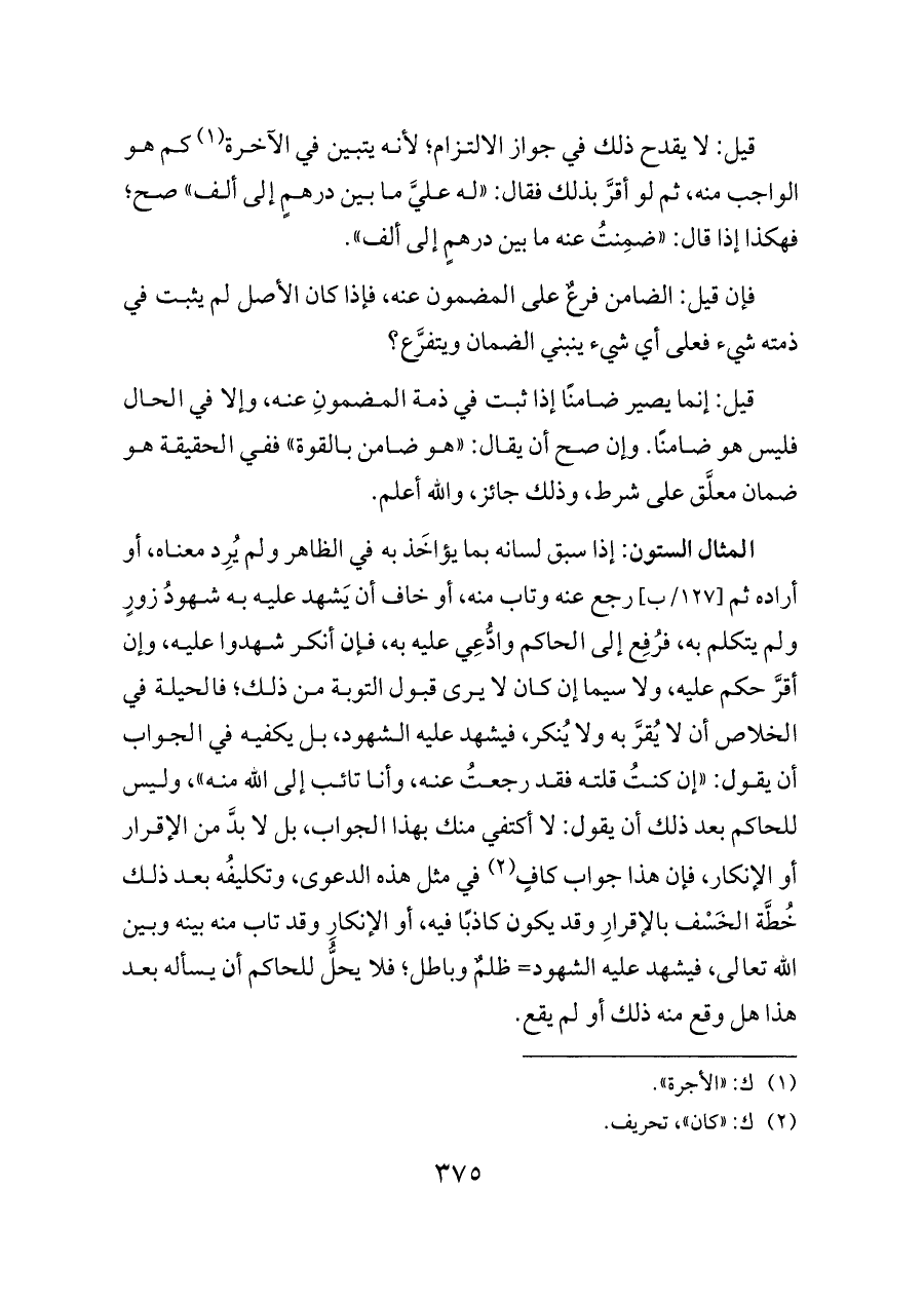 المثال الستون: إذا سبق لسانه بما يؤاخَذ به في الظاهر ولم يُرِد معناه، أو أراده ثم [١٢٧/ب] رجع عنه وتاب منه، أو خاف أن يَشهد عليه به شهودُ زورٍ ولم يتكلم به، فرُفِع إلى الحاكم وادُّعِي عليه به، فإن أنكر شهدوا عليه، وإن أقرَّ حكم عليه، ولا سيما إن كان لا يرى قبول التوبة من ذلك؛ فالحيلة في الخلاص أن لا يُقرَّ به ولا يُنكر، فيشهد عليه الشهود، بل يكفيه في الجواب أن يقول: «إن كنتُ قلته فقد رجعتُ عنه، وأنا تائب إلى الله منه»، وليس للحاكم بعد ذلك أن يقول: لا أكتفي منك بهذا الجواب، بل لا بدَّ من الإقرار أو الإنكار، فإن هذا جواب كافٍ (¬٢) في مثل هذه الدعوى، وتكليفُه بعد ذلك خُطَّة الخَسْف بالإقرارِ وقد يكون كاذبًا فيه، أو الإنكارِ وقد تاب منه بينه وبين الله تعالى، فيشهد عليه الشهود= ظلمٌ وباطل؛ فلا يحلُّ للحاكم أن يسأله بعد هذا هل وقع منه ذلك أو لم يقع.