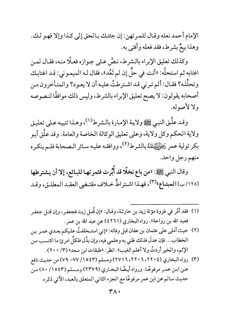 وكذلك تعليق الإبراء بالشرط، نصَّ على جوازه فعلًا منه، فقال لمن اغتابه ثم استحلَّه: «أنت في حلٍّ إن لم تَعُد»، فقال له الميموني: قد اغتابك وتحلِّله؟ فقال: ألم ترني قد اشترطتُ عليه أن لا يعود؟ والمتأخرون من أصحابه يقولون: لا يصح تعليق الإبراء بالشرط، وليس ذلك موافقًا لنصوصه ولا لأصوله.