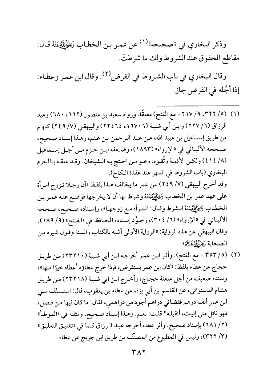 (¬٢) (٥/ ٣٥٣ - مع الفتح). وأثر ابن عمر أخرجه ابن أبي شيبة (٢٣٢١٠) من طريق حجاج عن عطاء بلفظ: «كان ابن عمر يستقرض، فإذا خرج عطاؤه أعطاه خيرًا منها»، وسنده ضعيف من أجل عنعنة حجاج، وأخرج ابن ابي شيبة (٢٣٢١٨) من طريق هشام الدستوائي، عن القاسم بن أبي بزة، عن عطاء بن يعقوب، قال: استسلف مني ابن عمر ألف درهم فقضاني دراهم أجود من دراهمي، فقال: ما كان فيها من فضل، فهو نائل مني إليك، أتقبله؟ قلت: نعم. وهذا إسناد صحيح، ومثله في «الموطأ» (٢/ ٦٨١) بإسناد صحيح. وأثر عطاء أخرجه عبد الرزاق كما في «تغليق التعليق» (٣/ ٣٢٢)، وليس في المطبوع من المصنّف من طريق ابن جريج عن عطاء.
