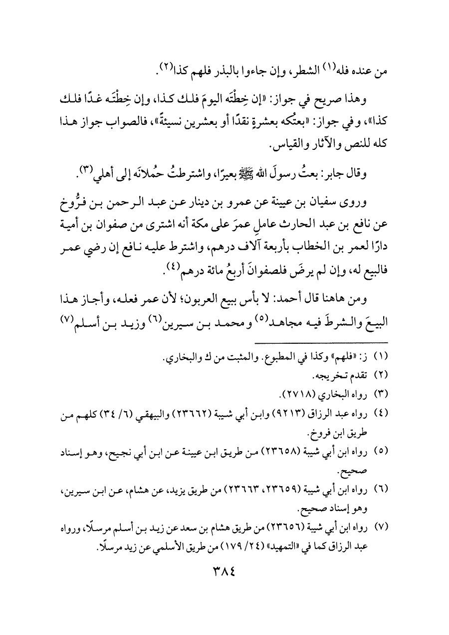 وروى سفيان بن عيينة عن عمرو بن دينار عن عبد الرحمن بن فرُّوخ عن نافع بن عبد الحارث عاملِ عمرَ على مكة أنه اشترى من صفوان بن أمية دارًا لعمر بن الخطاب بأربعة آلاف درهم، واشترط عليه نافع إن رضي عمر فالبيع له، وإن لم يرضَ فلصفوانَ أربعُ مائة درهم (¬٤).