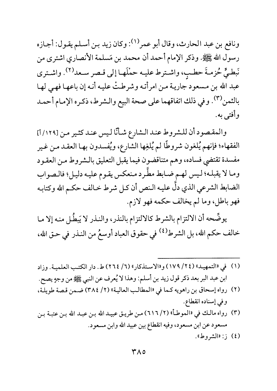 ونافع بن عبد الحارث، وقال أبو عمر (¬١): وكان زيد بن أسلم يقول: أجازه رسول الله - صلى الله عليه وسلم -. وذكر الإمام أحمد أن محمد بن مَسلمة الأنصاري اشترى من نَبطيٍّ حُزمةَ حطبٍ، واشترط عليه حمْلَها إلى قصر سعد (¬٢). واشترى عبد الله بن مسعود جارية من امرأته وشرطتْ عليه أنه إن باعها فهي لها بالثمن (¬٣). وفي ذلك اتفاقهما على صحة البيع والشرط، ذكره الإمام أحمد وأفتى به.