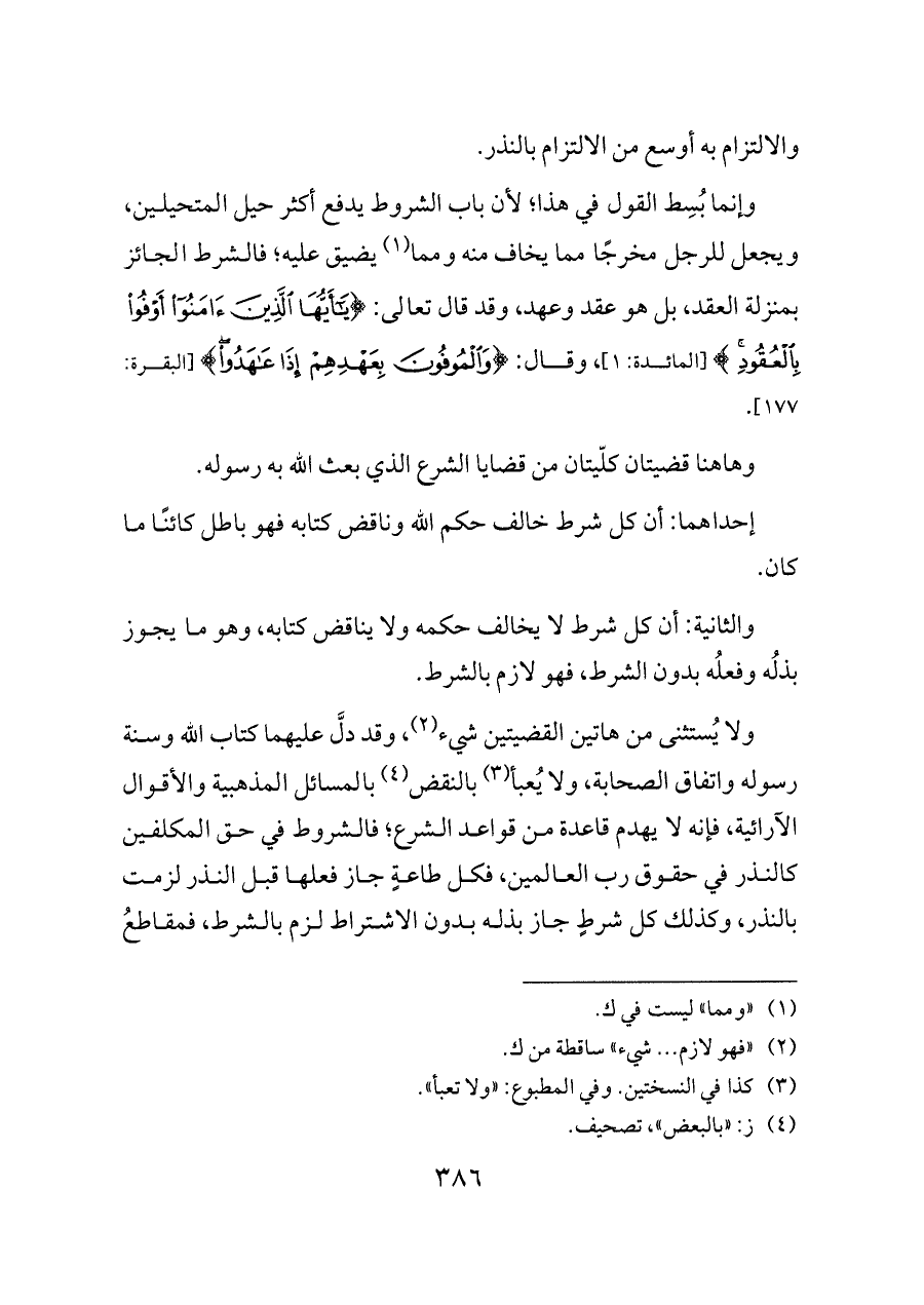 ولا يُستثنى من هاتين القضيتين شيء (¬٢)، وقد دلَّ عليهما كتاب الله وسنة رسوله واتفاق الصحابة، ولا يُعبأ (¬٣) بالنقض (¬٤) بالمسائل المذهبية والأقوال الآرائية، فإنه لا يهدم قاعدة من قواعد الشرع؛ فالشروط في حق المكلفين كالنذر في حقوق رب العالمين، فكل طاعةٍ جاز فعلها قبل النذر لزمت بالنذر، وكذلك كل شرطٍ جاز بذله بدون الاشتراط لزم بالشرط، فمقاطعُ