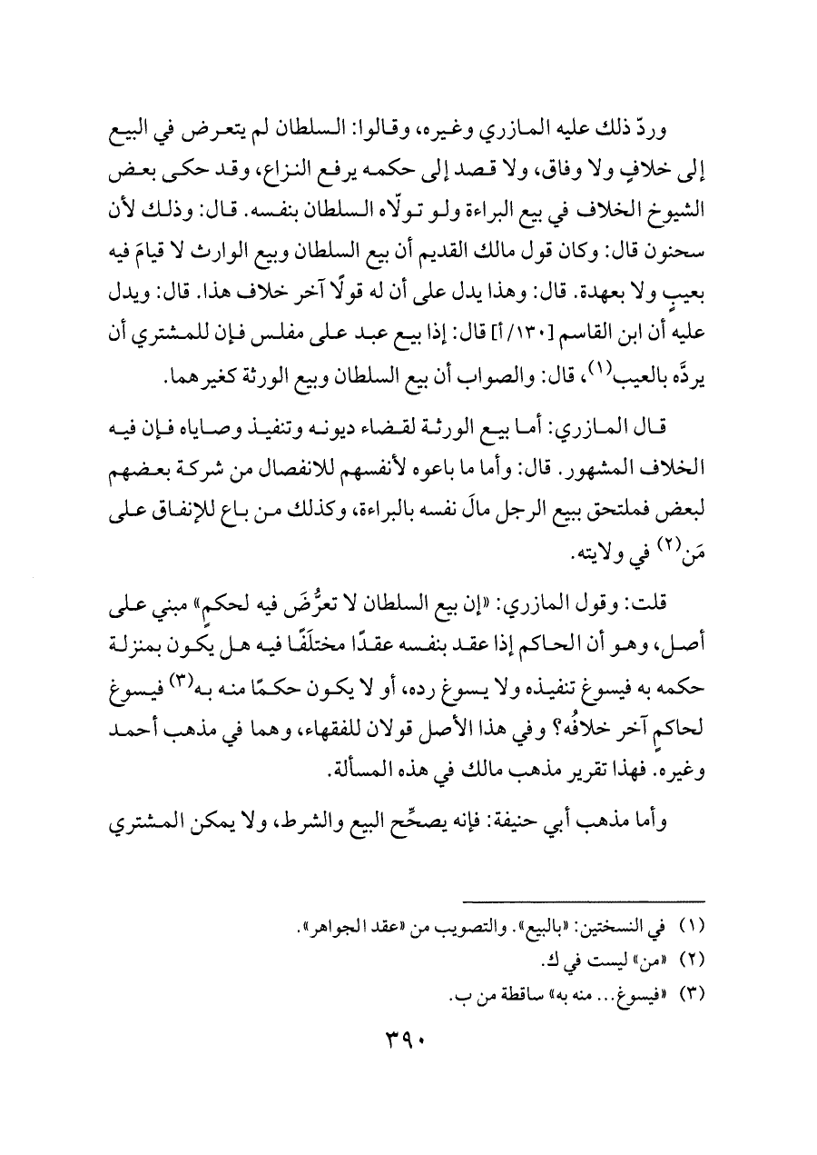 وردّ ذلك عليه المازري وغيره، وقالوا: السلطان لم يتعرض في البيع إلى خلافٍ ولا وفاق، ولا قصد إلى حكمه يرفع النزاع، وقد حكى بعض الشيوخ الخلاف في بيع البراءة ولو تولّاه السلطان بنفسه. قال: وذلك لأن سحنون قال: وكان قول مالك القديم أن بيع السلطان وبيع الوارث لا قيامَ فيه بعيبٍ ولا بعهدة. قال: وهذا يدل على أن له قولًا آخر خلاف هذا. قال: ويدل عليه أن ابن القاسم [١٣٠/أ] قال: إذا بيع عبد على مفلس فإن للمشتري أن يردَّه بالعيب (¬١)، قال: والصواب أن بيع السلطان وبيع الورثة كغيرهما.
