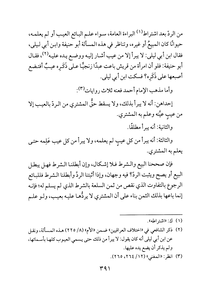 (¬٢) ذكر الشافعي في «اختلاف العراقيين» ضمن «الأم» (٨/ ٢٢٥) هذه المسألة، ونقل عن ابن أبي ليلى أنه كان يقول: لا يبرأ من ذلك حتى يسمي العيوب كلها بأسمائها، ولم يذكر أن يضع يده عليها.