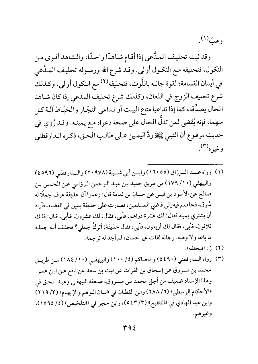 وقد ثبت تحليف المدَّعي إذا أقام شاهدًا واحدًا، والشاهد أقوى من النكول، فتحليفه مع النكول أولى. وقد شرع الله ورسوله تحليف المدَّعي في أيمان القسامة؛ لقوة جانبه باللَّوث، فتحليفه (¬٢) مع النكول أولى. وكذلك شرع تحليف الزوج في اللعان، وكذلك شرع تحليف المدعي إذا كان شاهد الحال يصدِّقه، كما إذا تداعيا متاع البيت أو تداعى النجّار والخيّاط آلة كل منهما، فإنه يُقضى لمن تدلُّ الحال على صحة دعواه مع يمينه. وقد رُوي في حديث مرفوع أن النبي - صلى الله عليه وسلم - ردَّ اليمين على طالب الحق، ذكره الدارقطني وغيره (¬٣).