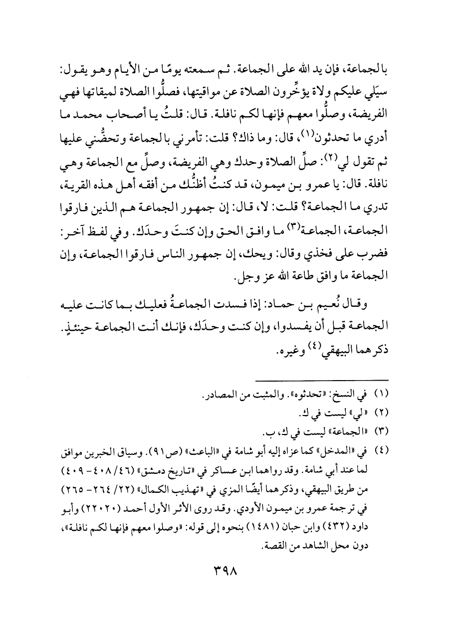 (¬٤) في «المدخل» كما عزاه إليه أبو شامة في «الباعث» (ص ٩١). وسياق الخبرين موافق لما عند أبي شامة. وقد رواهما ابن عساكر في «تاريخ دمشق» (٤٦/ ٤٠٨ - ٤٠٩) من طريق البيهقي، وذكرهما أيضًا المزي في «تهذيب الكمال» (٢٢/ ٢٦٤ - ٢٦٥) في ترجمة عمرو بن ميمون الأودي. وقد روى الأثر الأول أحمد (٢٢٠٢٠) وأبو داود (٤٣٢) وابن حبان (١٤٨١) بنحوه إلى قوله: «وصلوا معهم فإنها لكم نافلة»، دون محل الشاهد من القصة.