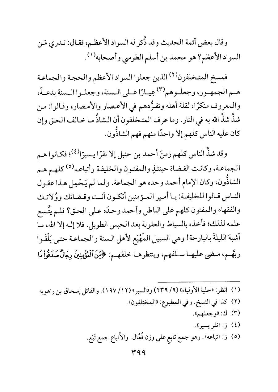 فمسخ المتخلفون (¬٢) الذين جعلوا السواد الأعظم والحجة والجماعة هم الجمهور، وجعلوهم (¬٣) عِيارًا على السنة، وجعلوا السنة بدعةً، والمعروف منكرًا، لقلة أهله وتفرُّدهم في الأعصار والأمصار، وقالوا: من شذَّ شذَّ الله به في النار. وما عرف المتخلفون أن الشاذَّ ما خالف الحق وإن كان عليه الناس كلهم إلا واحدًا منهم فهم الشاذُّون.