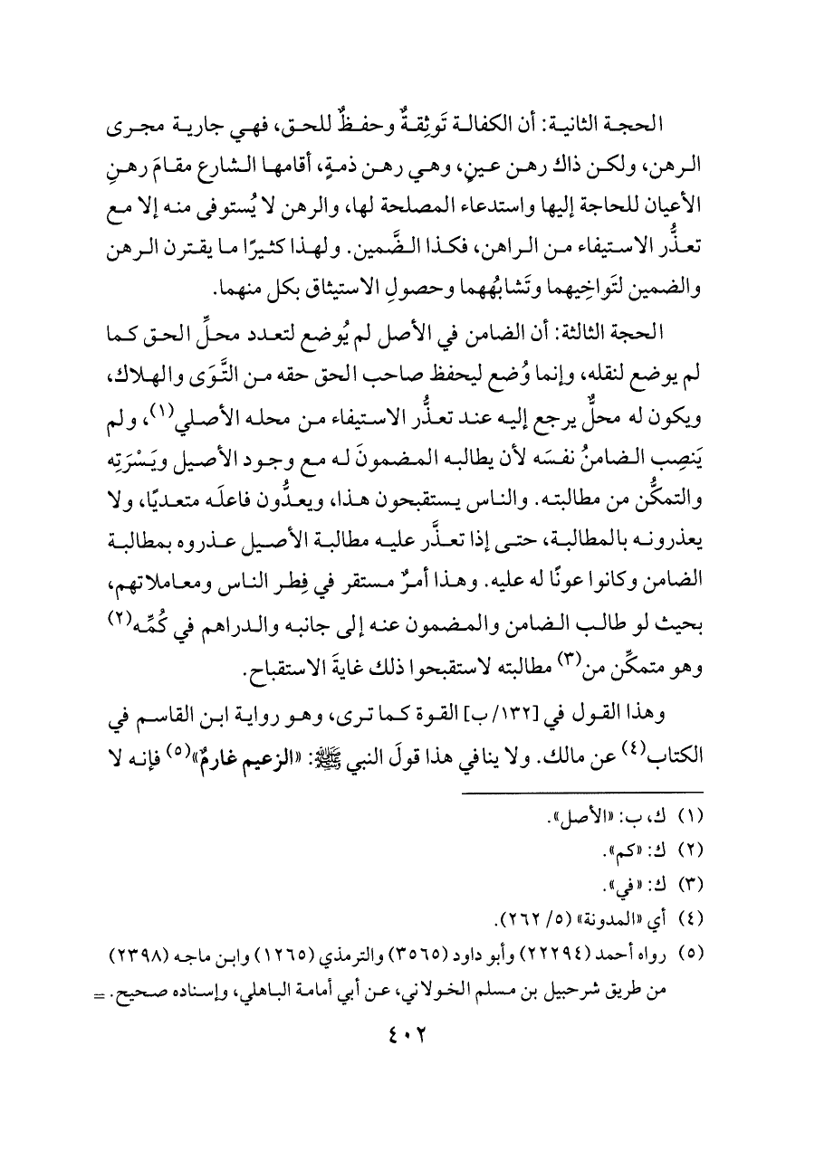 الحجة الثالثة: أن الضامن في الأصل لم يُوضع لتعدد محلِّ الحق كما لم يوضع لنقله، وإنما وُضع ليحفظ صاحب الحق حقه من التَّوَى والهلاك، ويكون له محلٌّ يرجع إليه عند تعذُّر الاستيفاء من محله الأصلي (¬١)، ولم يَنصِب الضامنُ نفسَه لأن يطالبه المضمونَ له مع وجود الأصيل ويَسْرَتِه والتمكُّن من مطالبته. والناس يستقبحون هذا، ويعدُّون فاعلَه متعديًا، ولا يعذرونه بالمطالبة، حتى إذا تعذَّر عليه مطالبة الأصيل عذروه بمطالبة الضامن وكانوا عونًا له عليه. وهذا أمرٌ مستقر في فِطر الناس ومعاملاتهم، بحيث لو طالب الضامن والمضمون عنه إلى جانبه والدراهم في كُمِّه (¬٢) وهو متمكِّن من (¬٣) مطالبته لاستقبحوا ذلك غايةَ الاستقباح.
