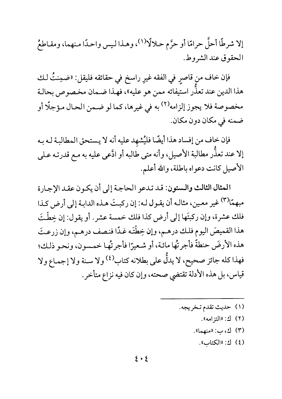 المثال الثالث والستون: قد تدعو الحاجة إلى أن يكون عقد الإجارة مبهمًا (¬٣) غير معين، مثاله أن يقول له: إن ركبتَ هذه الدابة إلى أرض كذا فلك عشرة، وإن ركبتَها إلى أرض كذا فلك خمسة عشر. أو يقول: إن خِطْتَ هذا القميصَ اليوم فلك درهم، وإن خِطْتَه غدًا فنصف درهم، وإن زرعتَ هذه الأرضَ حنطةً فأجرتُها مائة، أو شعيرًا فأجرتُها خمسون، ونحو ذلك؛ فهذا كله جائز صحيح، لا يدلُّ على بطلانه كتاب (¬٤) ولا سنة ولا إجماع ولا قياس، بل هذه الأدلة تقتضي صحته، وإن كان فيه نزاع متأخر.