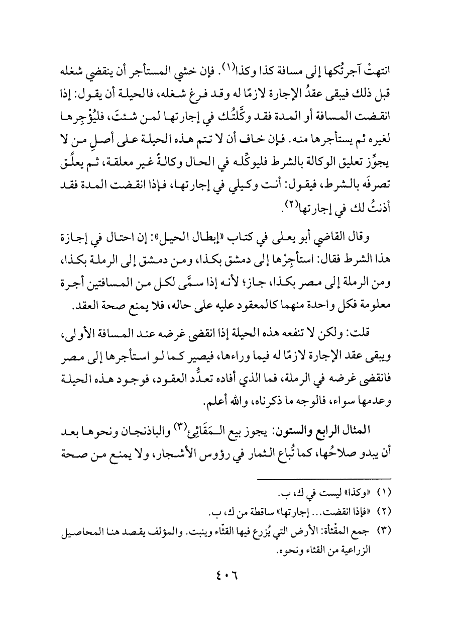 وقال القاضي أبو يعلى في كتاب «إبطال الحيل»: إن احتال في إجازة هذا الشرط فقال: استأجِرْها إلى دمشق بكذا، ومن دمشق إلى الرملة بكذا، ومن الرملة إلى مصر بكذا، جاز؛ لأنه إذا سمَّى لكل من المسافتين أجرة معلومة فكل واحدة منهما كالمعقود عليه على حاله، فلا يمنع صحة العقد.