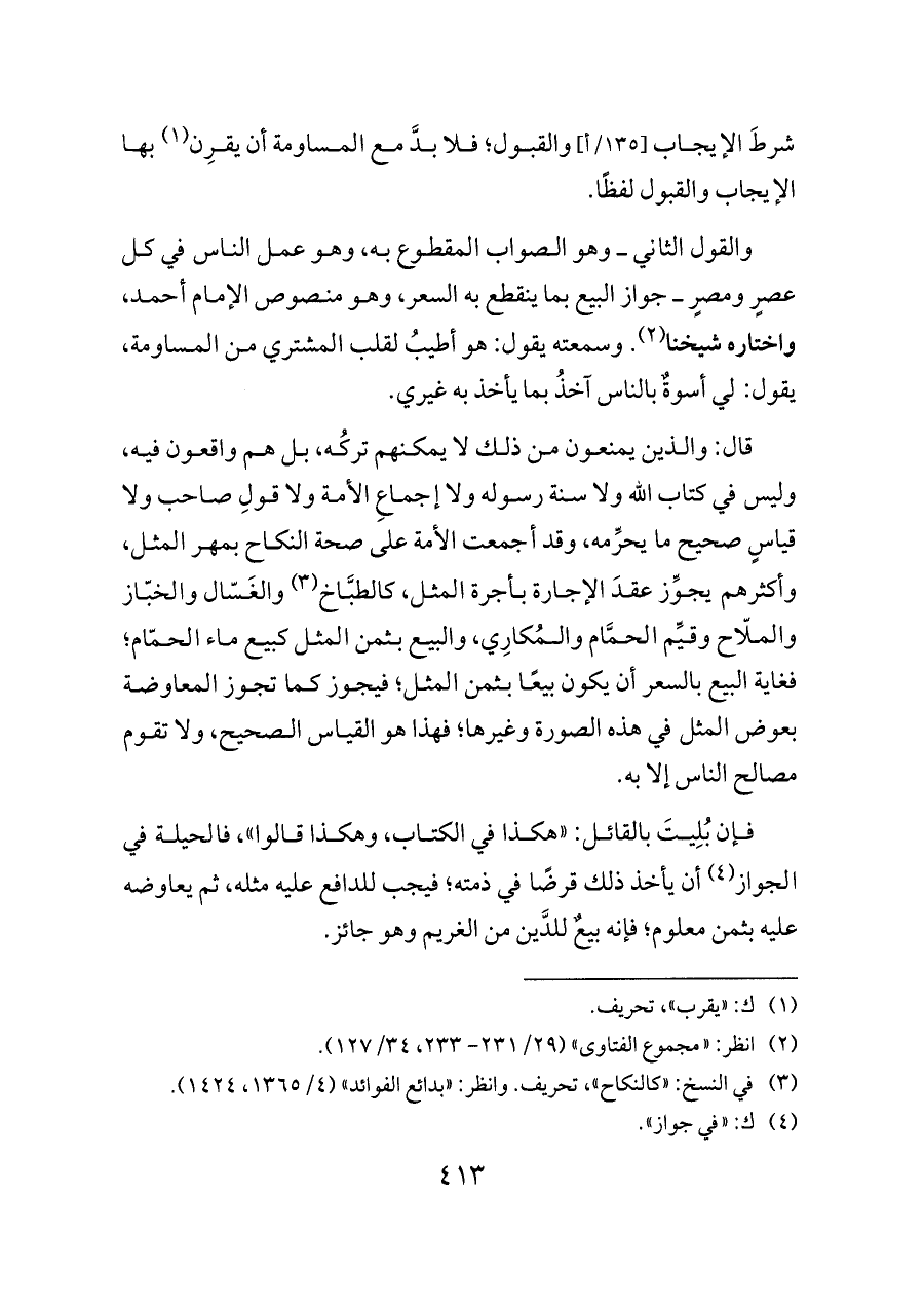قال: والذين يمنعون من ذلك لا يمكنهم تركُه، بل هم واقعون فيه، وليس في كتاب الله ولا سنة رسوله ولا إجماعِ الأمة ولا قولِ صاحب ولا قياسٍ صحيح ما يحرِّمه، وقد أجمعت الأمة على صحة النكاح بمهر المثل، وأكثرهم يجوِّز عقدَ الإجارة بأجرة المثل، كالطبَّاخ (¬٣) والغَسّال والخبّاز والملّاح وقيِّم الحمَّام والمُكارِي، والبيع بثمن المثل كبيع ماء الحمّام؛ فغاية البيع بالسعر أن يكون بيعًا بثمن المثل؛ فيجوز كما تجوز المعاوضة بعوض المثل في هذه الصورة وغيرها؛ فهذا هو القياس الصحيح، ولا تقوم مصالح الناس إلا به.