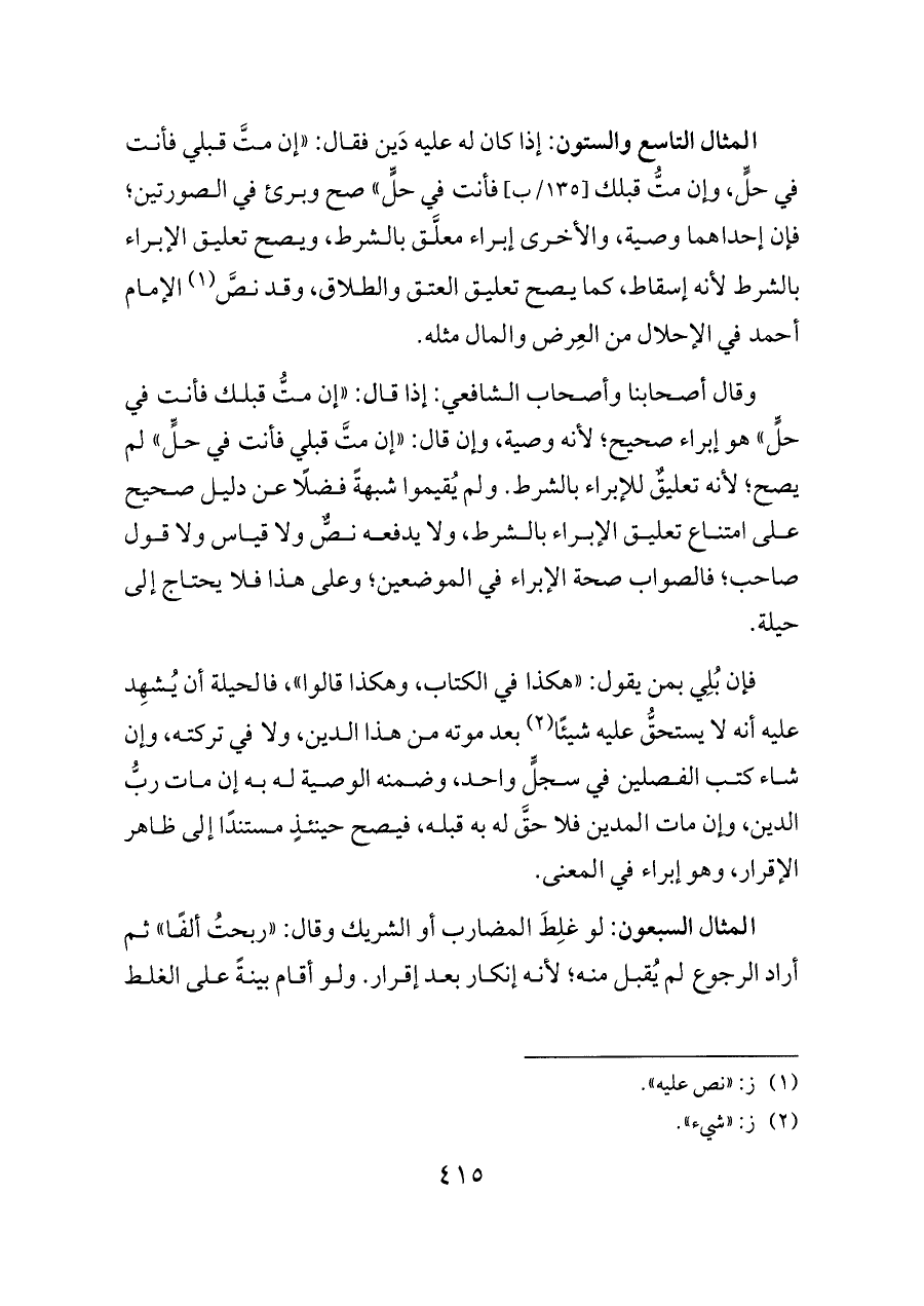 وقال أصحابنا وأصحاب الشافعي: إذا قال: «إن متُّ قبلك فأنت في حلٍّ» هو إبراء صحيح؛ لأنه وصية، وإن قال: «إن متَّ قبلي فأنت في حلٍّ» لم يصح؛ لأنه تعليقٌ للإبراء بالشرط. ولم يُقيموا شبهةً فضلًا عن دليل صحيح على امتناع تعليق الإبراء بالشرط، ولا يدفعه نصٌّ ولا قياس ولا قول صاحب؛ فالصواب صحة الإبراء في الموضعين؛ وعلى هذا فلا يحتاج إلى حيلة.