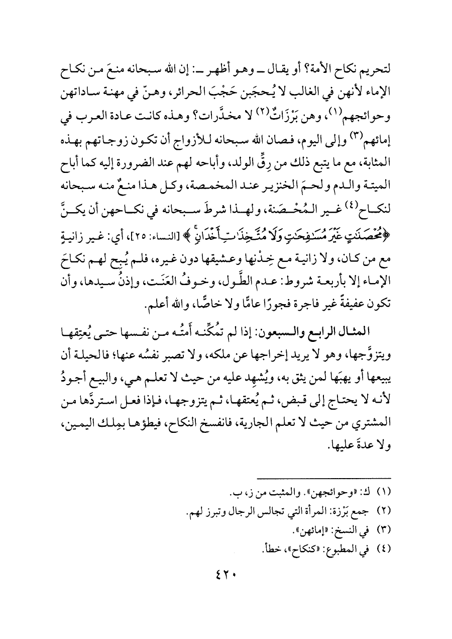 لتحريم نكاح الأمة؟ أو يقال ــ وهو أظهر ــ: إن الله سبحانه منعَ من نكاح الإماء لأنهن في الغالب لا يُحجَبن حَجْبَ الحرائر، وهنّ في مهنة ساداتهن وحوائجهم (¬١)، وهن بَرْزَاتٌ (¬٢) لا مخدَّرات؟ وهذه كانت عادة العرب في إمائهم (¬٣) وإلى اليوم، فصان الله سبحانه للأزواج أن تكون زوجاتهم بهذه المثابة، مع ما يتبع ذلك من رِقِّ الولد، وأباحه لهم عند الضرورة إليه كما أباح الميتة والدم ولحمَ الخنزير عند المخمصة، وكل هذا منعٌ منه سبحانه لنكاح (¬٤) غير المُحْصَنة، ولهذا شرطَ سبحانه في نكاحهن أن يكنَّ {مُحْصَنَاتٍ غَيْرَ مُسَافِحَاتٍ وَلَا مُتَّخِذَاتِ أَخْدَانٍ} [النساء: ٢٥]، أي: غير زانيةٍ مع من كان، ولا زانية مع خِدْنِها وعشيقها دون غيره، فلم يُبِح لهم نكاحَ الإماء إلا بأربعة شروط: عدم الطَّول، وخوفُ العَنَت، وإذنُ سيدها، وأن تكون عفيفةً غير فاجرة فجورًا عامًّا ولا خاصًّا، والله أعلم.