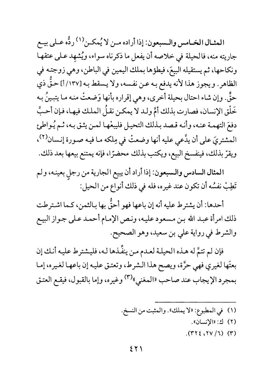 المثال الخامس والسبعون: إذا أراده من لا يُمكن (¬١) ردُّه على بيع جاريته منه، فالحيلة في خلاصه أن يفعل ما ذكرناه سواء، ويُشهِد على عتقها ونكاحها، ثم يستقيله البيعَ، فيطؤها بملك اليمين في الباطن، وهي زوجته في الظاهر. ويجوز هذا لأنه يدفع به عن نفسه، ولا يسقط به [١٣٧/أ] حقُّ ذي حقٍّ. وإن شاء احتال بحيلة أخرى، وهي إقراره بأنها وَضعتْ منه ما يتبينُ به خَلْق الإنسان، فصارت بذلك أمَّ ولد لا يمكن نقلُ الملك فيها، فإن أحبَّ دفعَ التهمة عنه، وأنه قصد بذلك التحيل فليبعْها لمن يثق به، ثم يُواطئ المشتريَ على أن يدَّعي عليه أنها وضعتْ في مِلكه ما فيه صورة إنسان (¬٢)، ويقرّ بذلك، فينفسخ البيع، ويكتب بذلك محضرًا، فإنه يمتنع بيعها بعد ذلك.