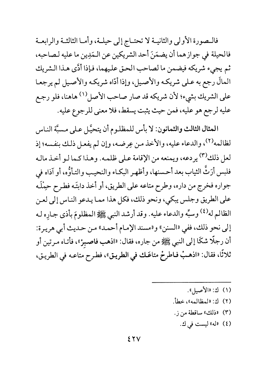 المثال الثالث والثمانون: لا بأس للمظلوم أن يتحيَّل على مسبَّة الناس لظالمه (¬٢)، والدعاء عليه، والأخذ من عِرضه، وإن لم يفعل ذلك بنفسه؛ إذ لعل ذلك (¬٣) يردعه، ويمنعه من الإقامة على ظلمه. وهذا كما لو أخذ ماله فلبس أرَثَّ الثياب بعد أحسنها، وأظهر البكاء والنحيب والتأوُّه، أو آذاه في جواره فخرج من داره، وطرح متاعه على الطريق، أو أخذ دابتَه فطرح حِمْلَه على الطريق وجلس يبكي، ونحو ذلك، فكل هذا مما يدعو الناس إلى لعن الظالم له (¬٤) وسبِّه والدعاء عليه. وقد أرشد النبي - صلى الله عليه وسلم - المظلومَ بأذى جارِه له إلى نحو ذلك، ففي «السنن» و «مسند الإمام أحمد» من حديث أبي هريرة: أن رجلًا شكَا إلى النبي - صلى الله عليه وسلم - من جاره، فقال: «اذهب فاصبِرْ»، فأتاه مرتين أو ثلاثًا، فقال: «اذهبْ فاطرحْ متاعَك في الطريق»، فطرح متاعه في الطريق،