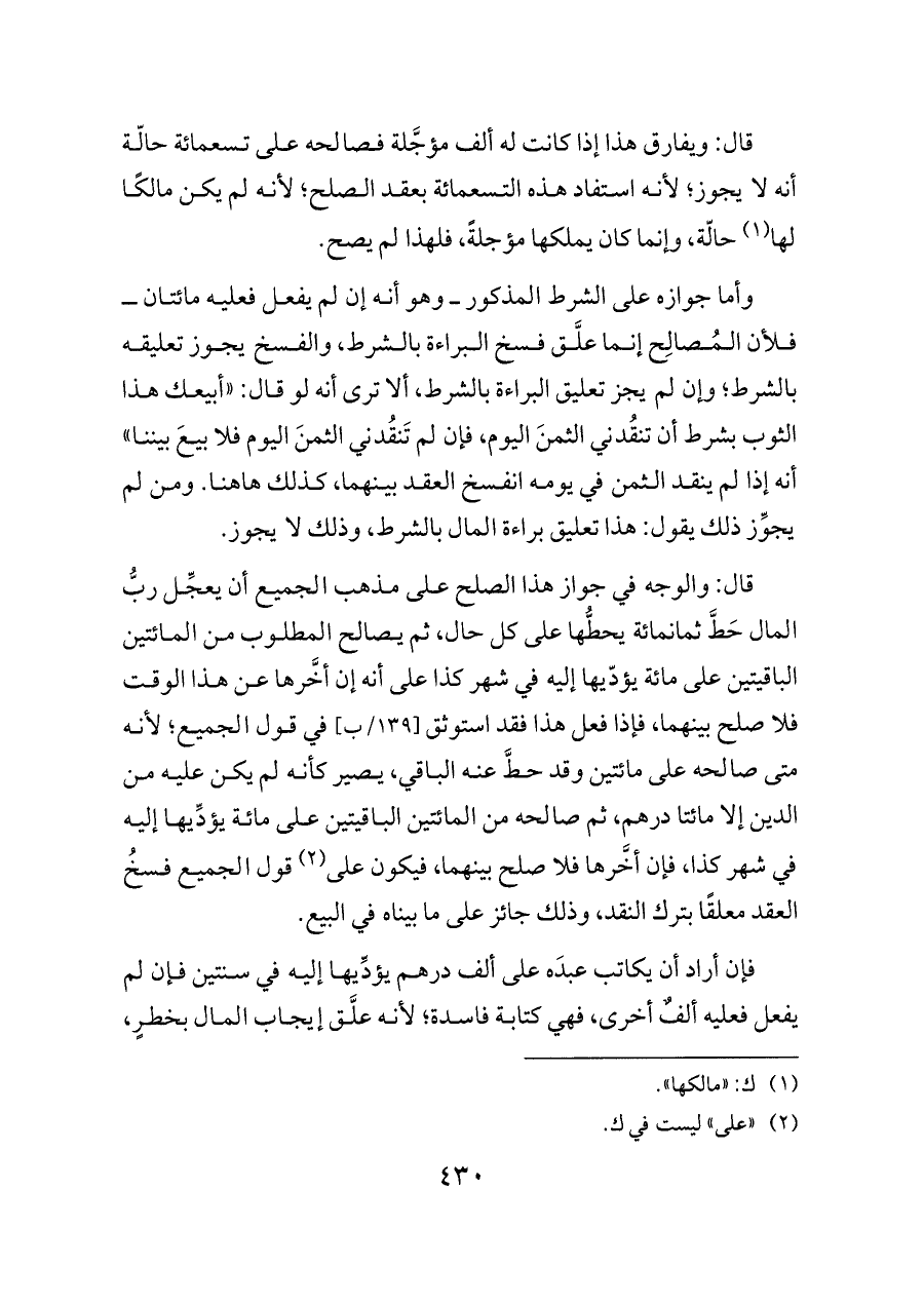 قال: والوجه في جواز هذا الصلح على مذهب الجميع أن يعجِّل ربُّ المال حَطَّ ثمانمائة يحطُّها على كل حال، ثم يصالح المطلوب من المائتين الباقيتين على مائة يؤدّيها إليه في شهر كذا على أنه إن أخَّرها عن هذا الوقت فلا صلح بينهما، فإذا فعل هذا فقد استوثق [١٣٩/ب] في قول الجميع؛ لأنه متى صالحه على مائتين وقد حطَّ عنه الباقي، يصير كأنه لم يكن عليه من الدين إلا مائتا درهم، ثم صالحه من المائتين الباقيتين على مائة يؤدِّيها إليه في شهر كذا، فإن أخَّرها فلا صلح بينهما، فيكون على (¬٢) قول الجميع فسخُ العقد معلقًا بترك النقد، وذلك جائز على ما بيناه في البيع.