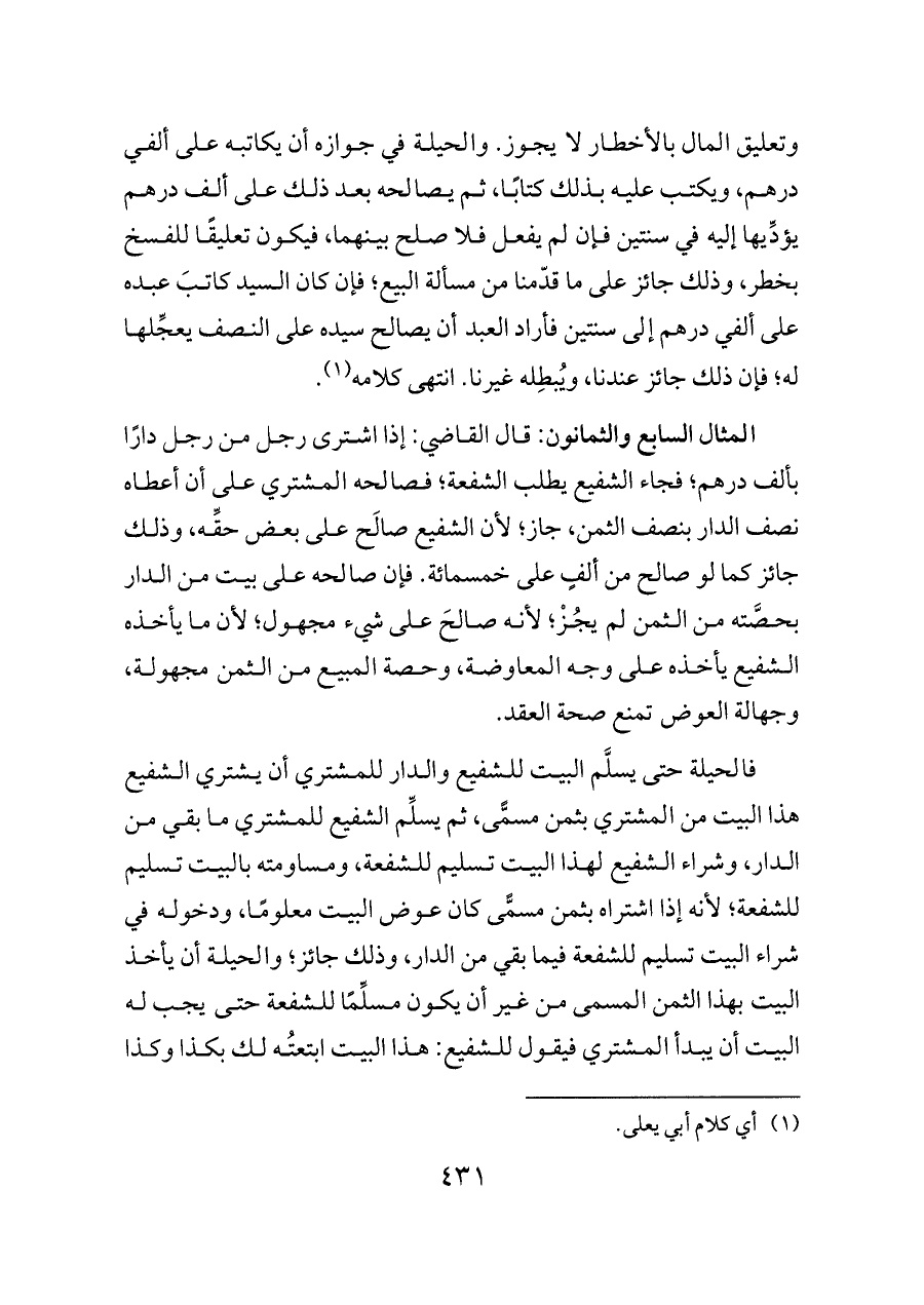 المثال السابع والثمانون: قال القاضي: إذا اشترى رجل من رجل دارًا بألف درهم؛ فجاء الشفيع يطلب الشفعة؛ فصالحه المشتري على أن أعطاه نصف الدار بنصف الثمن، جاز؛ لأن الشفيع صالَح على بعض حقِّه، وذلك جائز كما لو صالح من ألفٍ على خمسمائة. فإن صالحه على بيت من الدار بحصَّته من الثمن لم يجُزْ؛ لأنه صالحَ على شيء مجهول؛ لأن ما يأخذه الشفيع يأخذه على وجه المعاوضة، وحصة المبيع من الثمن مجهولة، وجهالة العوض تمنع صحة العقد.