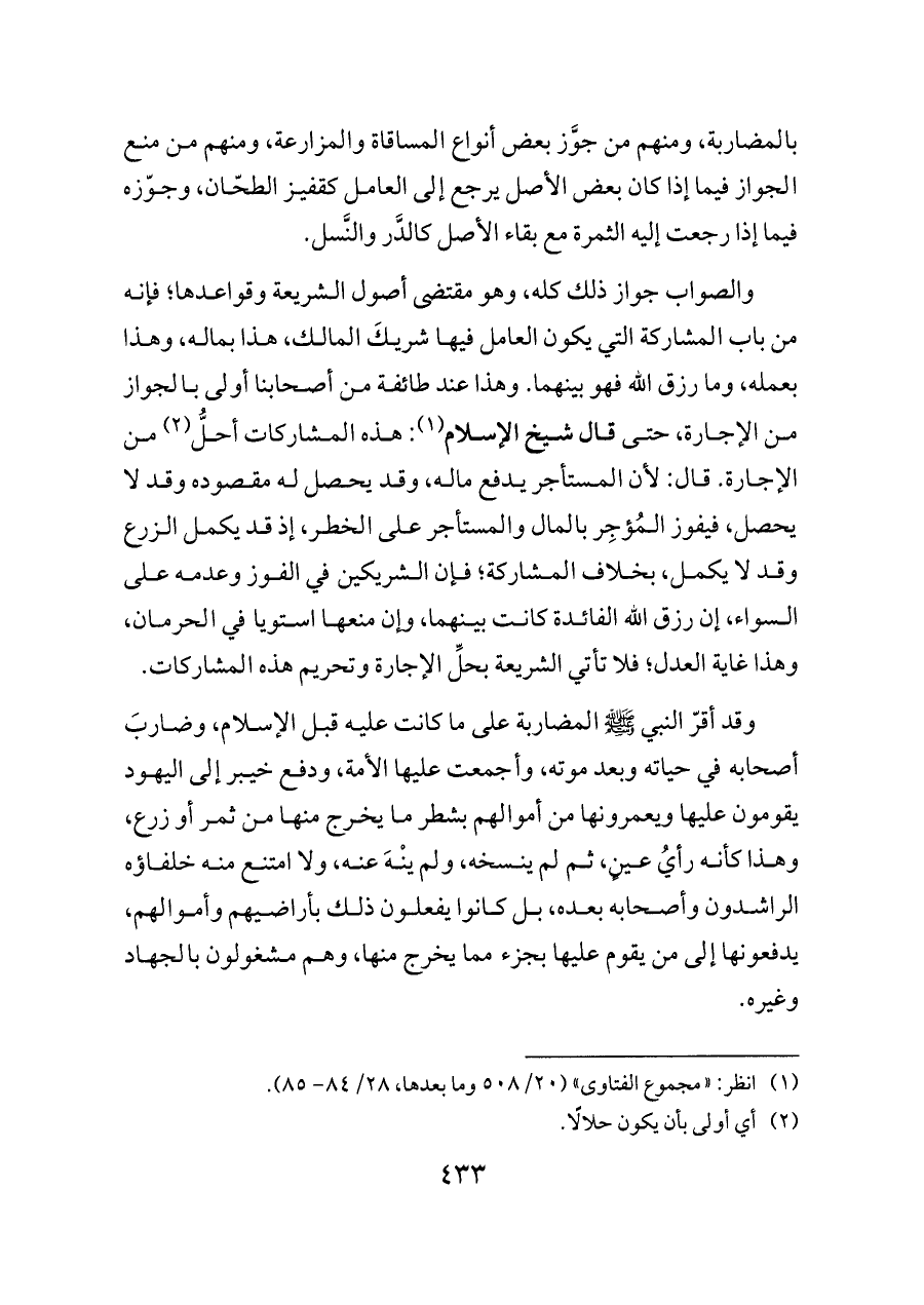 والصواب جواز ذلك كله، وهو مقتضى أصول الشريعة وقواعدها؛ فإنه من باب المشاركة التي يكون العامل فيها شريكَ المالك، هذا بماله، وهذا بعمله، وما رزق الله فهو بينهما. وهذا عند طائفة من أصحابنا أولى بالجواز من الإجارة، حتى قال شيخ الإسلام (¬١): هذه المشاركات أحلُّ (¬٢) من الإجارة. قال: لأن المستأجر يدفع ماله، وقد يحصل له مقصوده وقد لا يحصل، فيفوز المُؤجِر بالمال والمستأجر على الخطر، إذ قد يكمل الزرع وقد لا يكمل، بخلاف المشاركة؛ فإن الشريكين في الفوز وعدمه على السواء، إن رزق الله الفائدة كانت بينهما، وإن منعها استويا في الحرمان، وهذا غاية العدل؛ فلا تأتي الشريعة بحلِّ الإجارة وتحريم هذه المشاركات.