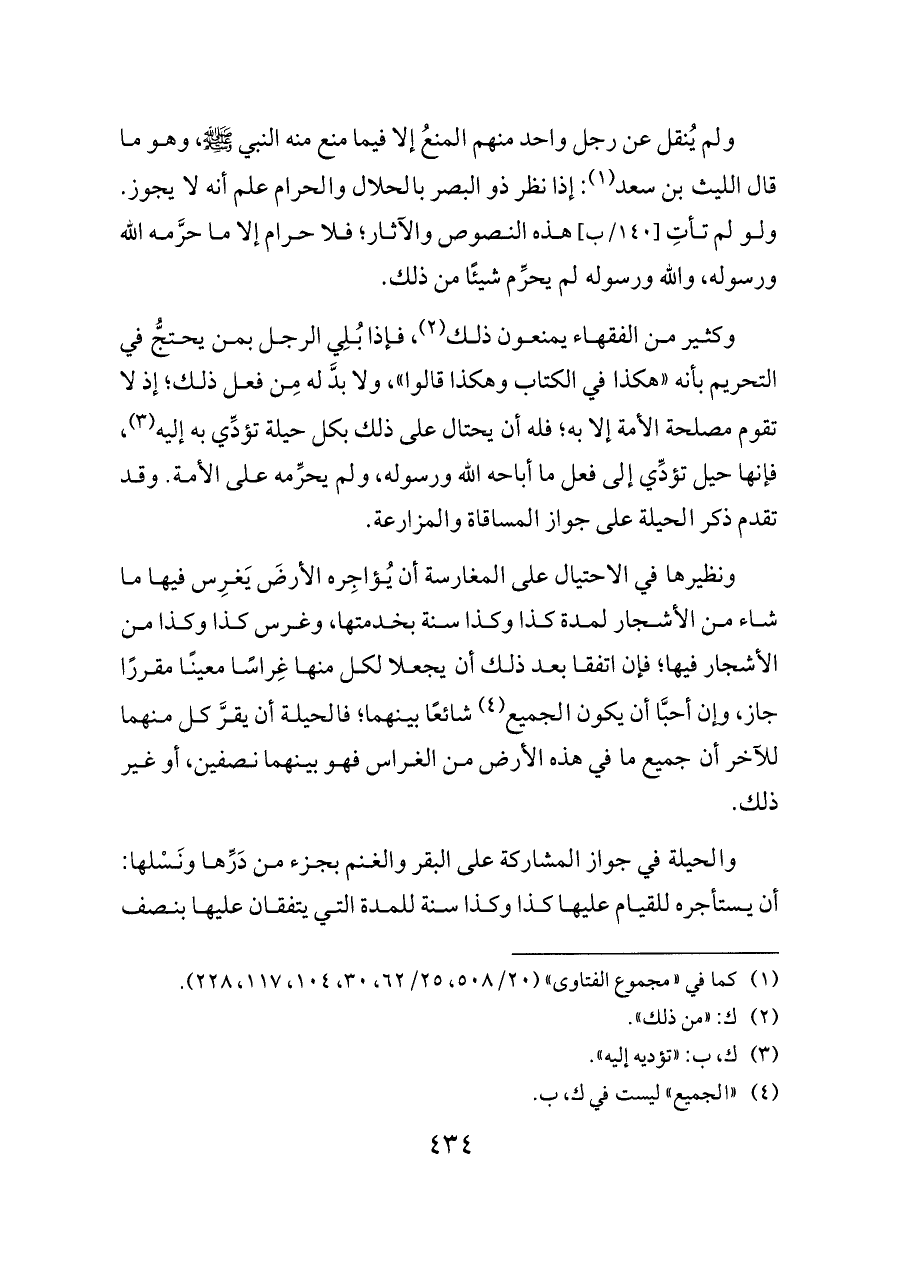 وكثير من الفقهاء يمنعون ذلك (¬٢)، فإذا بُلِي الرجل بمن يحتجُّ في التحريم بأنه «هكذا في الكتاب وهكذا قالوا»، ولا بدَّ له مِن فعل ذلك؛ إذ لا تقوم مصلحة الأمة إلا به؛ فله أن يحتال على ذلك بكل حيلة تؤدِّي به إليه (¬٣)، فإنها حيل تؤدِّي إلى فعل ما أباحه الله ورسوله، ولم يحرِّمه على الأمة. وقد تقدم ذكر الحيلة على جواز المساقاة والمزارعة.
