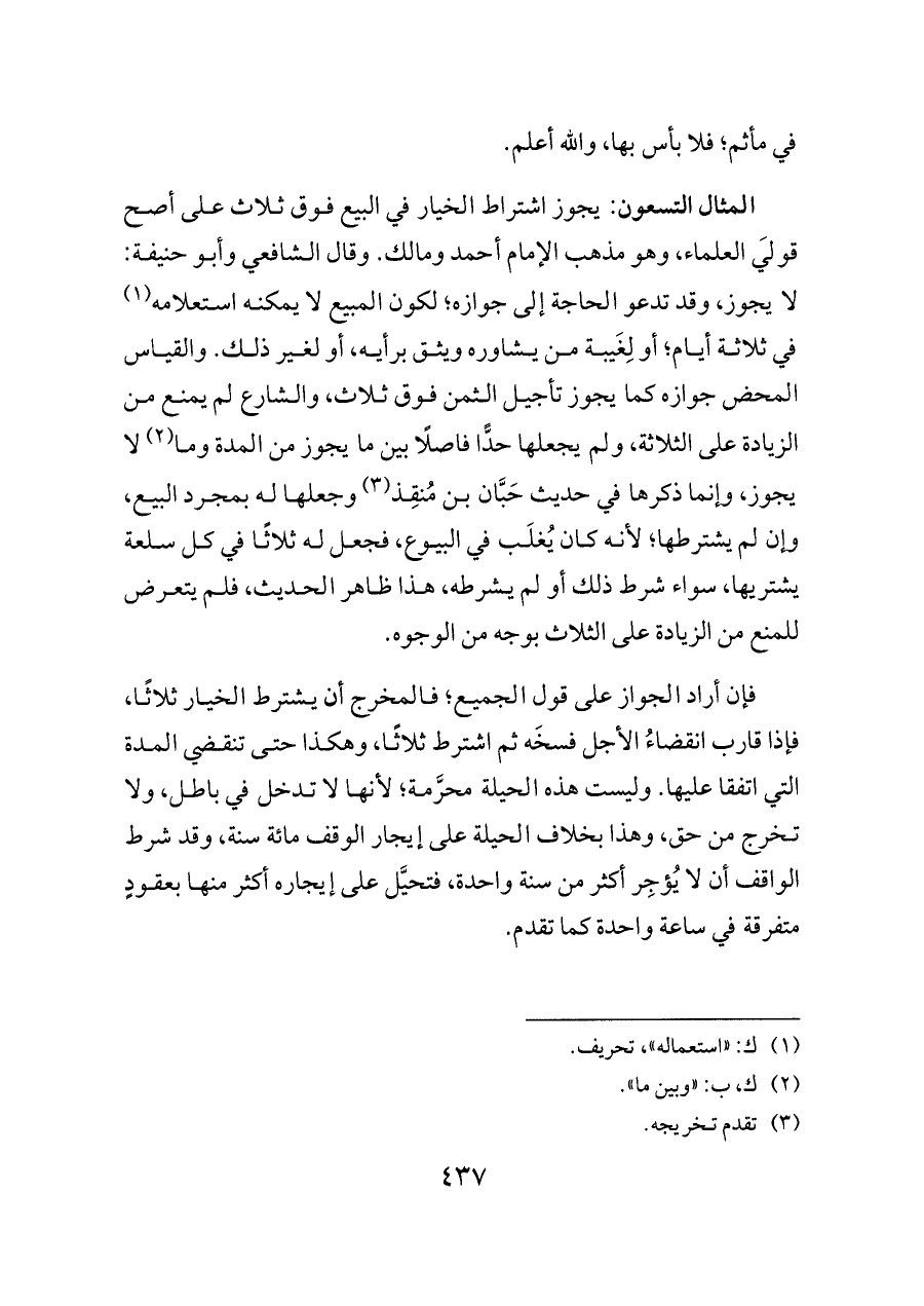 المثال التسعون: يجوز اشتراط الخيار في البيع فوق ثلاث على أصح قولَي العلماء، وهو مذهب الإمام أحمد ومالك. وقال الشافعي وأبو حنيفة: لا يجوز، وقد تدعو الحاجة إلى جوازه؛ لكون المبيع لا يمكنه استعلامه (¬١) في ثلاثة أيام؛ أو لِغَيبة من يشاوره ويثق برأيه، أو لغير ذلك. والقياس المحض جوازه كما يجوز تأجيل الثمن فوق ثلاث، والشارع لم يمنع من الزيادة على الثلاثة، ولم يجعلها حدًّا فاصلًا بين ما يجوز من المدة وما (¬٢) لا يجوز، وإنما ذكرها في حديث حَبَّان بن مُنقِذ (¬٣) وجعلها له بمجرد البيع، وإن لم يشترطها؛ لأنه كان يُغلَب في البيوع، فجعل له ثلاثًا في كل سلعة يشتريها، سواء شرط ذلك أو لم يشرطه، هذا ظاهر الحديث، فلم يتعرض للمنع من الزيادة على الثلاث بوجه من الوجوه.