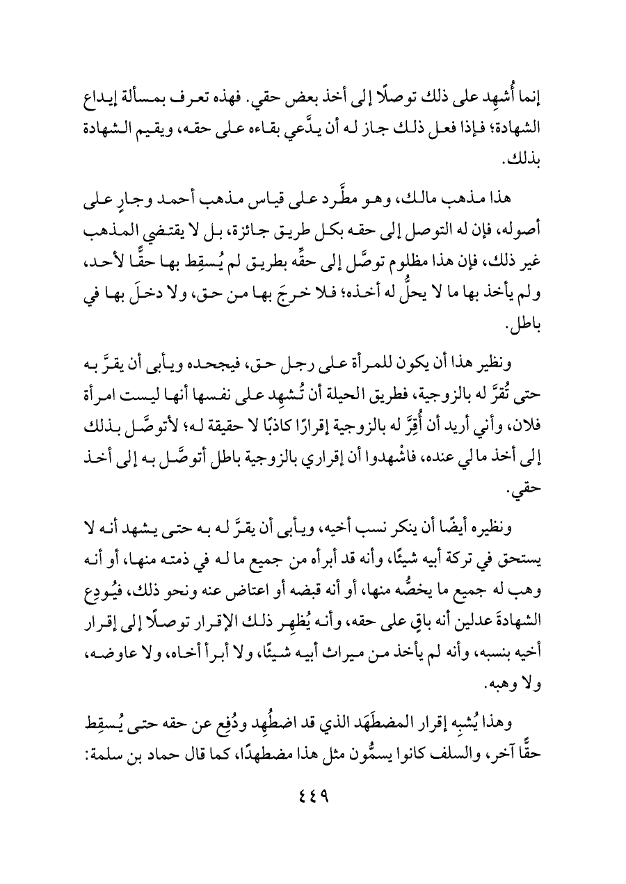 ونظير هذا أن يكون للمرأة على رجل حق، فيجحده ويأبى أن يقرَّ به حتى تُقرَّ له بالزوجية، فطريق الحيلة أن تُشهِد على نفسها أنها ليست امرأة فلان، وأني أريد أن أُقِرَّ له بالزوجية إقرارًا كاذبًا لا حقيقة له؛ لأتوصَّل بذلك إلى أخذ مالي عنده، فاشْهدوا أن إقراري بالزوجية باطل أتوصَّل به إلى أخذ حقي.
