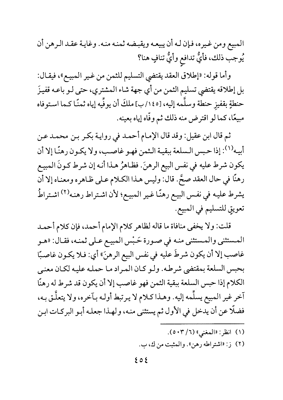 قلت: ولا يخفى منافاة ما قاله لظاهر كلام الإمام أحمد، فإن كلام أحمد المستثنى والمستثنى منه في صورة حَبْس المبيع على ثمنه، فقال: «هو غاصب إلا أن يكون شرطَ عليه في نفس البيع الرهنَ» أي: فلا يكون غاصبًا بحبس السلعة بمقتضى شرطه. ولو كان المراد ما حمله عليه لكان معنى الكلام إذا حبس السلعة ببقية الثمن فهو غاصب إلا أن يكون قد شرط له رهنًا آخر غير المبيع يسلِّمه إليه. وهذا كلام لا يرتبط أوله بآخره، ولا يتعلَّق به، فضلًا عن أن يدخل في الأول ثم يستثنى منه، ولهذا جعله أبو البركات ابن