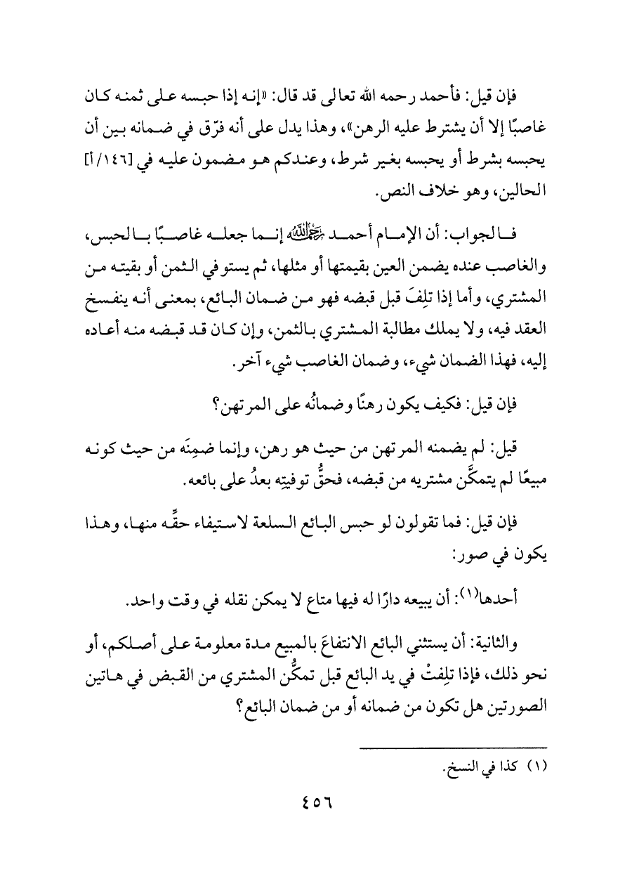 فإن قيل: فأحمد رحمه الله تعالى قد قال: «إنه إذا حبسه على ثمنه كان غاصبًا إلا أن يشترط عليه الرهن»، وهذا يدل على أنه فرّق في ضمانه بين أن يحبسه بشرط أو يحبسه بغير شرط، وعندكم هو مضمون عليه في [١٤٦/أ] الحالين، وهو خلاف النص.