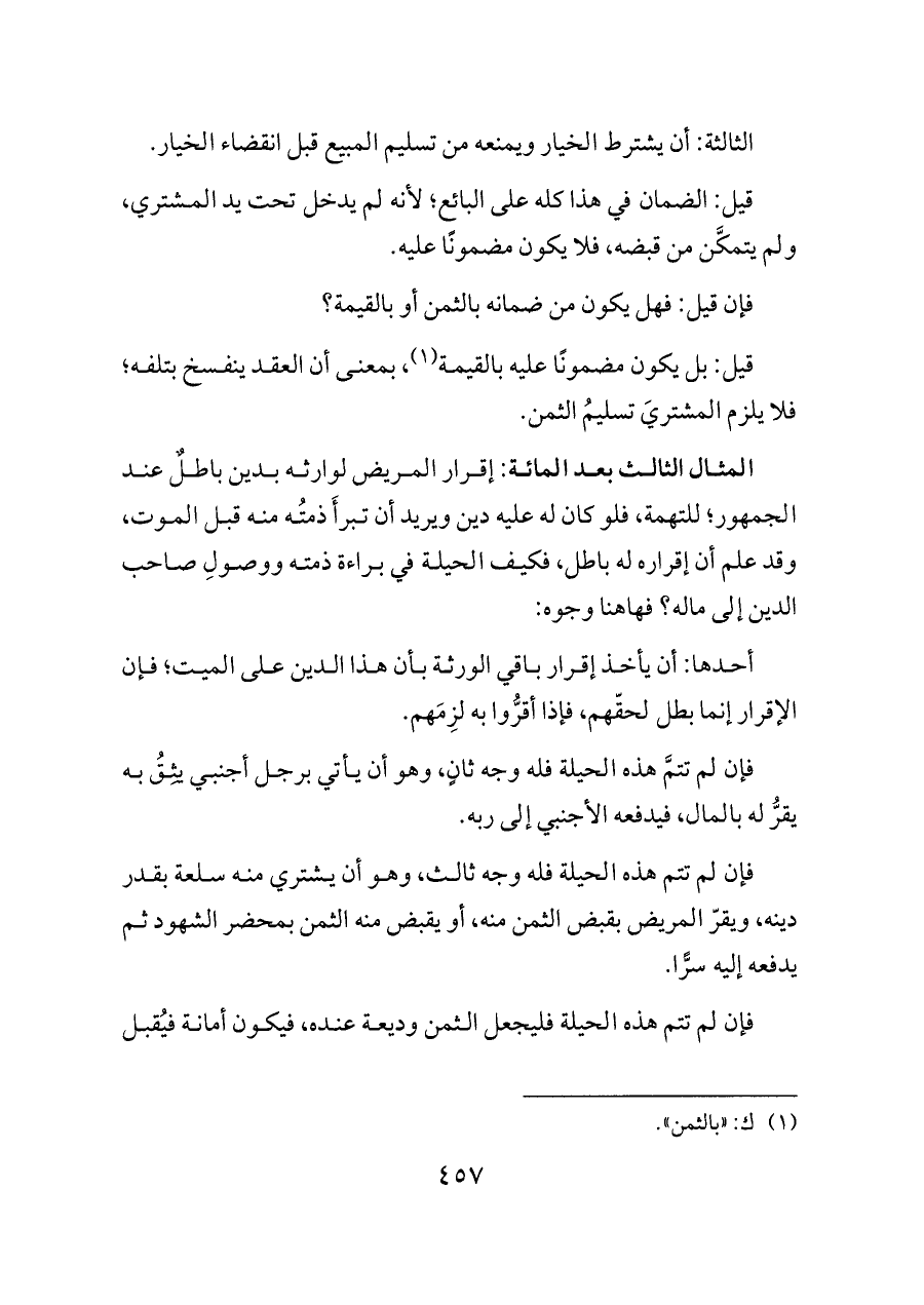 فإن لم تتم هذه الحيلة فله وجه ثالث، وهو أن يشتري منه سلعة بقدر دينه، ويقرّ المريض بقبض الثمن منه، أو يقبض منه الثمن بمحضر الشهود ثم يدفعه إليه سرًّا.