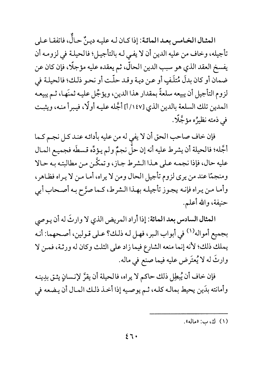المثال الخامس بعد المائة: إذا كان له عليه دينٌ حالٌّ، فاتفقا على تأجيله، وخاف من عليه الدين أن لا يفي له بالتأجيل؛ فالحيلة في لزومه أن يفسخ العقد الذي هو سبب الدين الحالّ، ثم يعقده عليه مؤجلًا، فإن كان عن ضمان أو كان بدلَ مُتلَفٍ أو عن دية وقد حلّت أو نحو ذلك؛ فالحيلة في لزوم التأجيل أن يبيعه سلعةً بمقدار هذا الدين، ويؤجِّل عليه ثمنَها، ثم يبيعه المدين تلك السلعة بالدين الذي [١٤٧/أ] أجَّله عليه أولًا، فيبرأ منه، ويثبت في ذمته نظيرُه مؤجَّلًا.