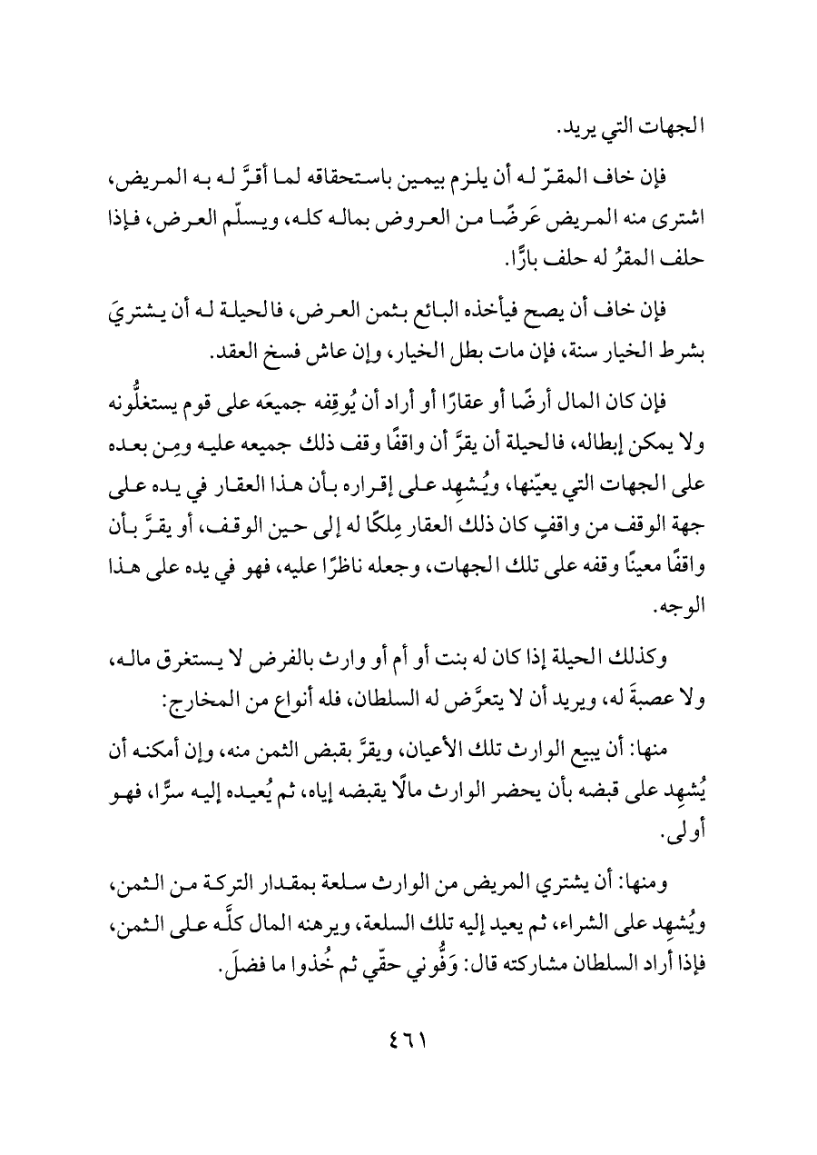 ومنها: أن يشتري المريض من الوارث سلعة بمقدار التركة من الثمن، ويُشهِد على الشراء، ثم يعيد إليه تلك السلعة، ويرهنه المال كلَّه على الثمن، فإذا أراد السلطان مشاركته قال: وَفُّوني حقّي ثم خُذوا ما فضلَ.